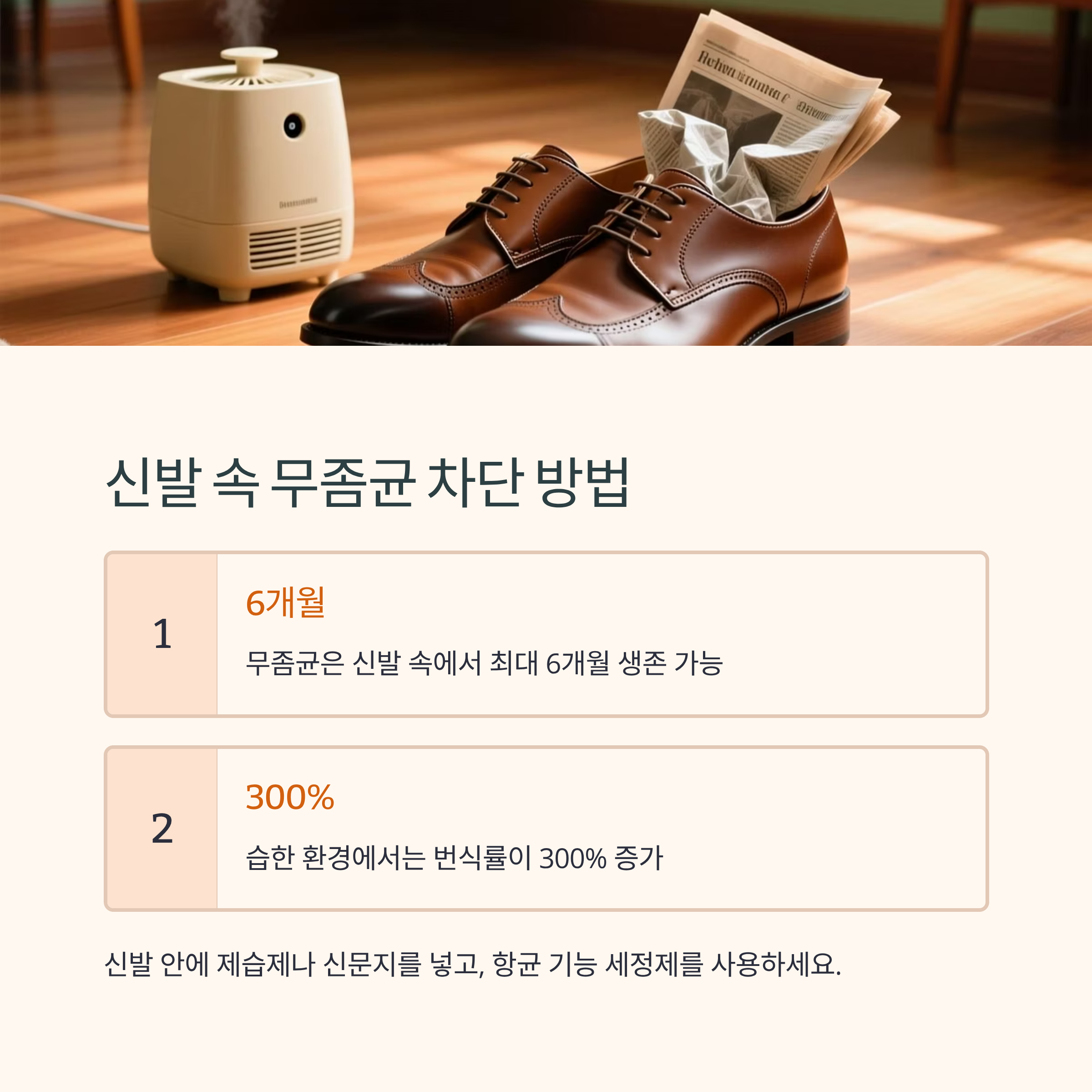 무좀균은 신발 속에서 최대 6개월 생존할 수 있으며, 습한 환경에서는 번식률이 300% 증가합니다. 신발 안에 제습제나 신문지를 넣어 관리하고, 항균 기능 세정제를 사용하면 무좀균 번식을 막을 수 있습니다.