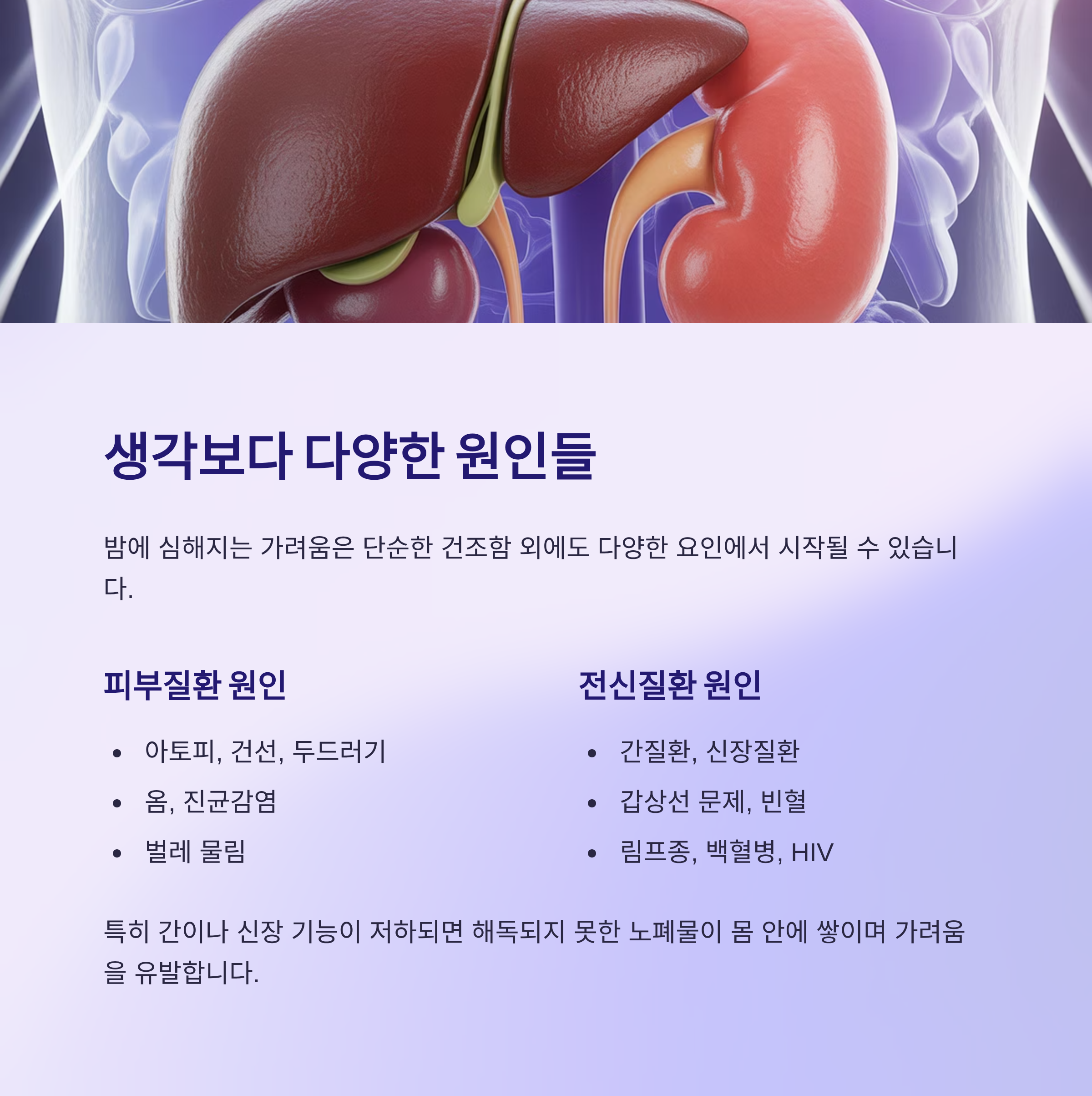 밤에 심해지는 가려움은 단순한 건조함 외에도 다양한 요인에서 시작될 수 있습니다.