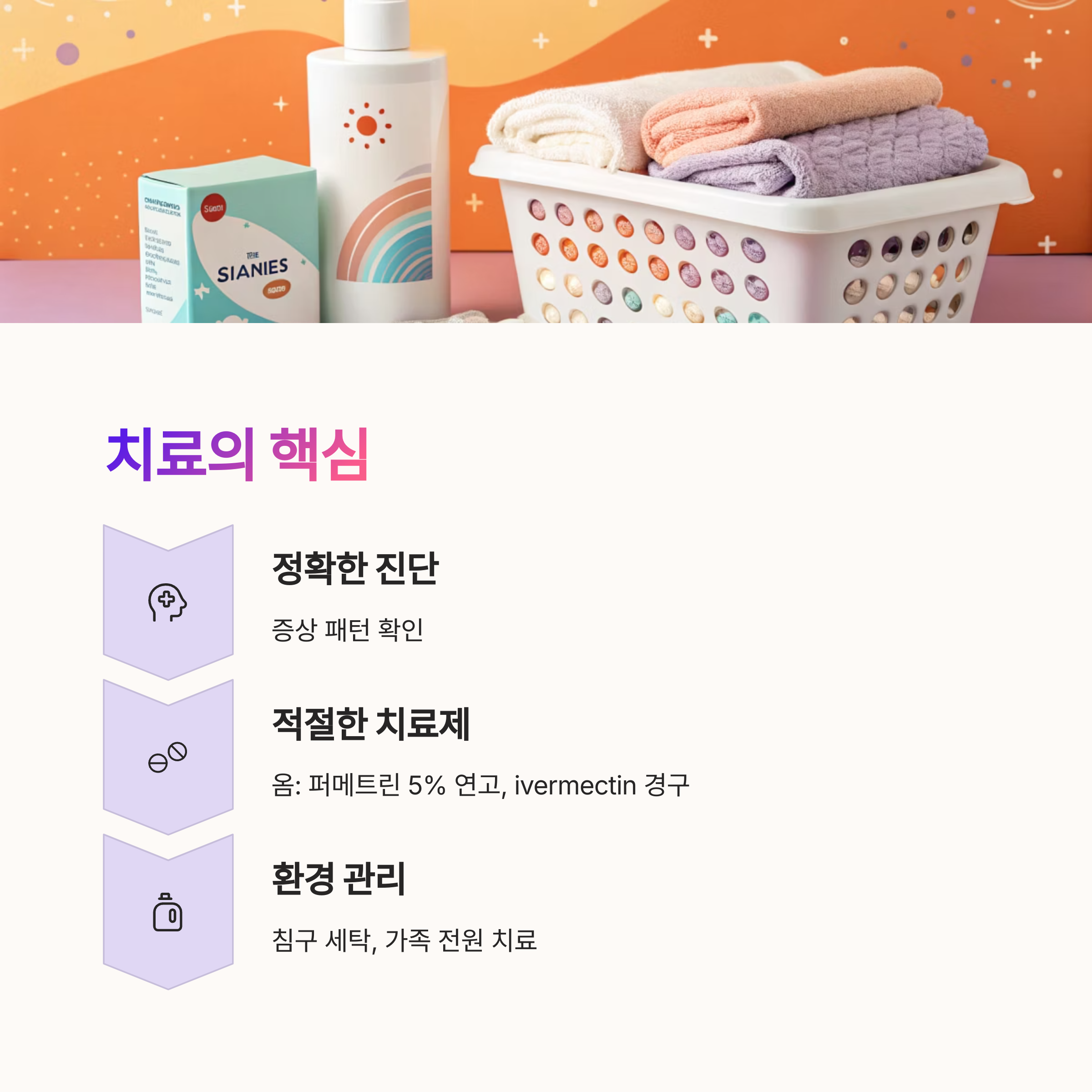 침구 세탁, 가족 전원 치료 등 환경 정리가 병행되어야 합니다.