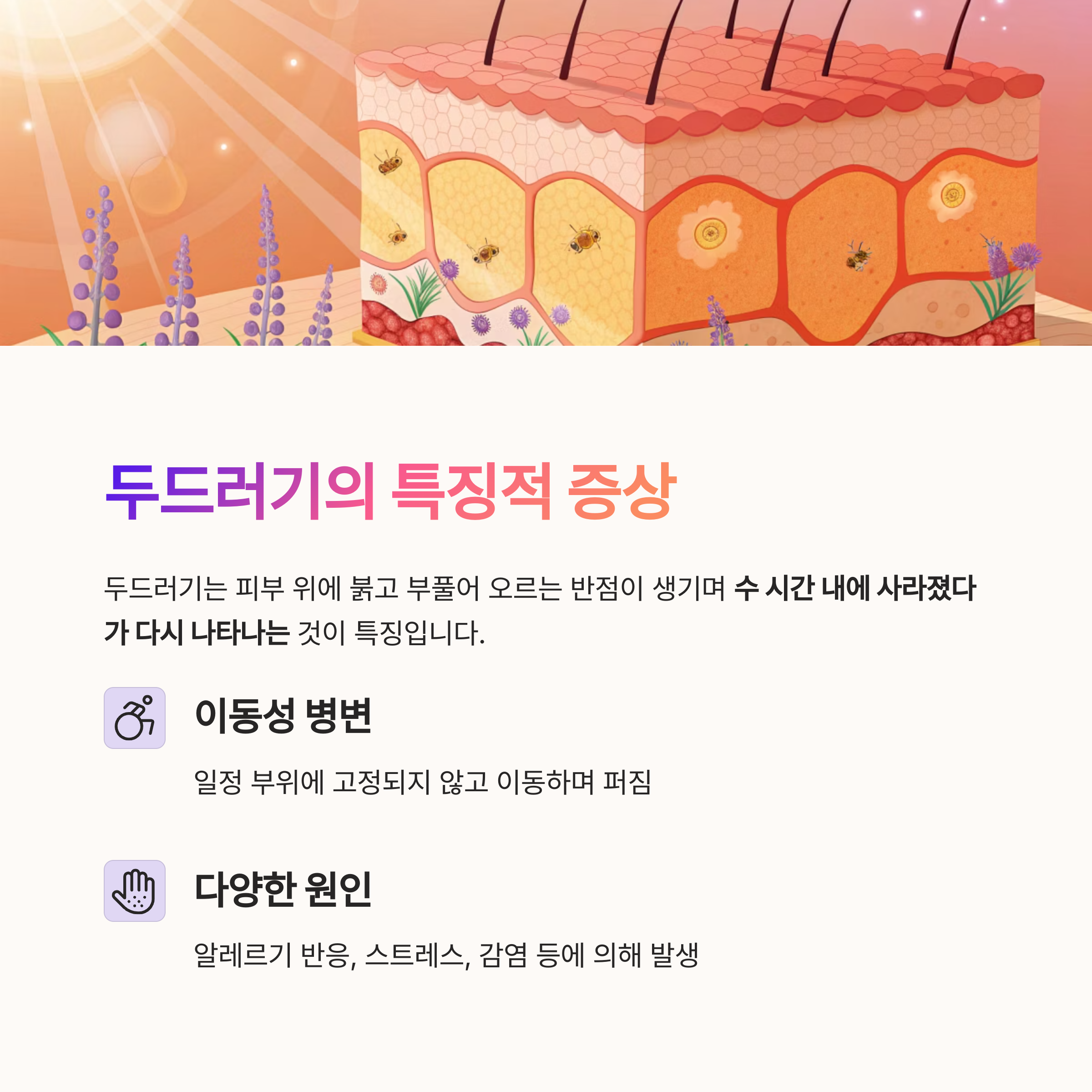 두드러기는 피부 위에 붉고 부풀어 오르는 반점(구진)이 생기며