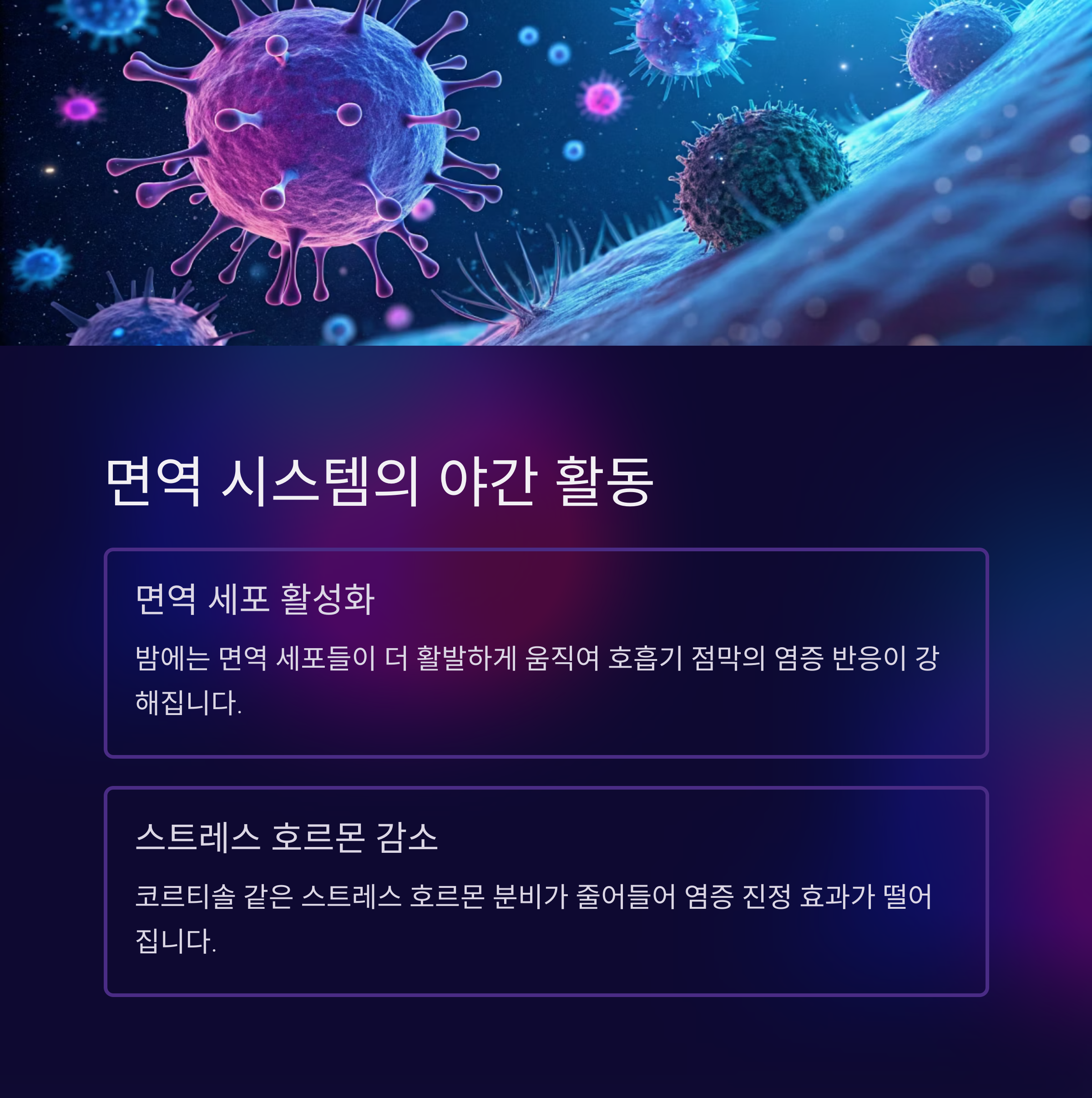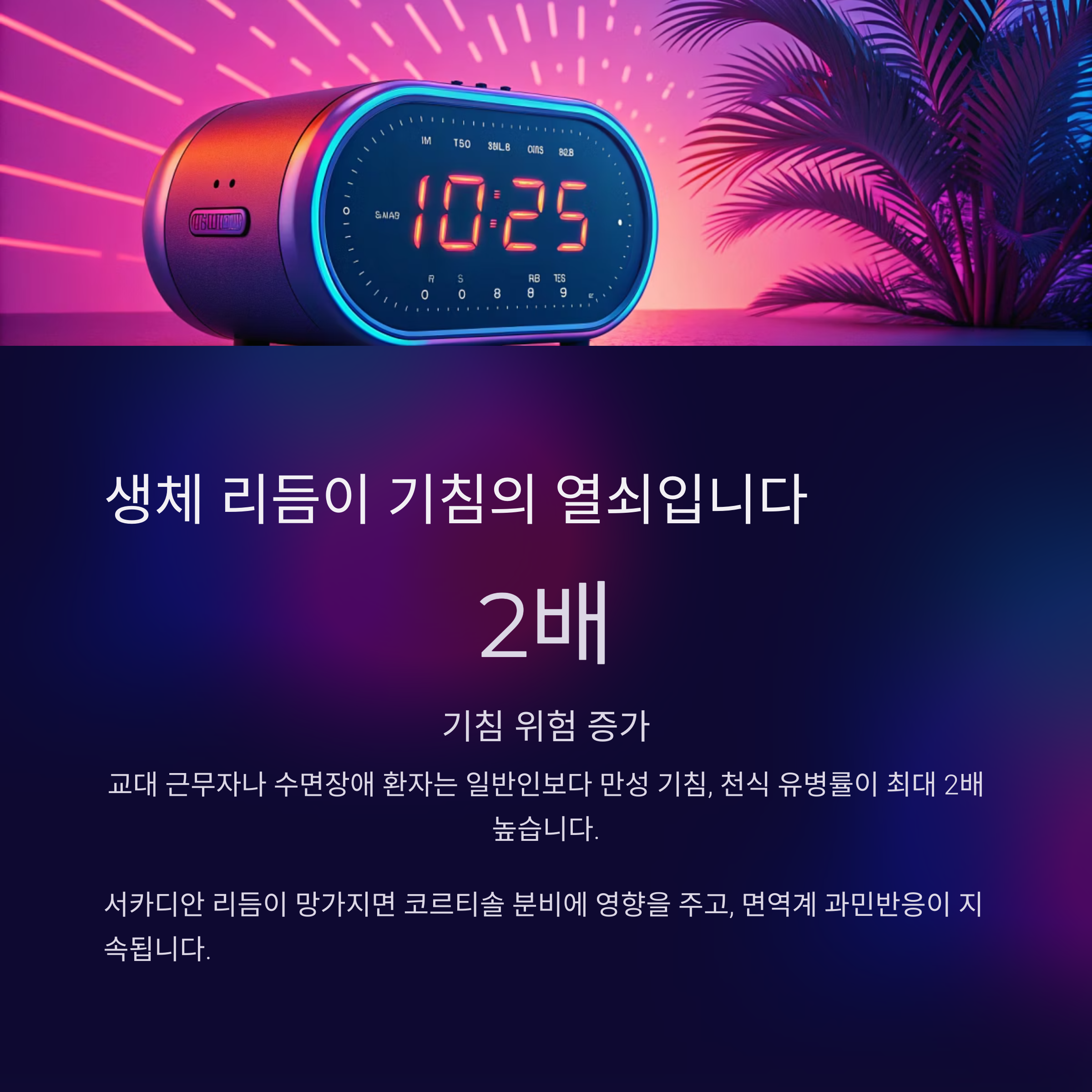 서카디안 리듬이 망가지면 코르티솔 분비에 영향을 주고, 면역계 과민반응이 야간에도 지속되기 쉽습니다.