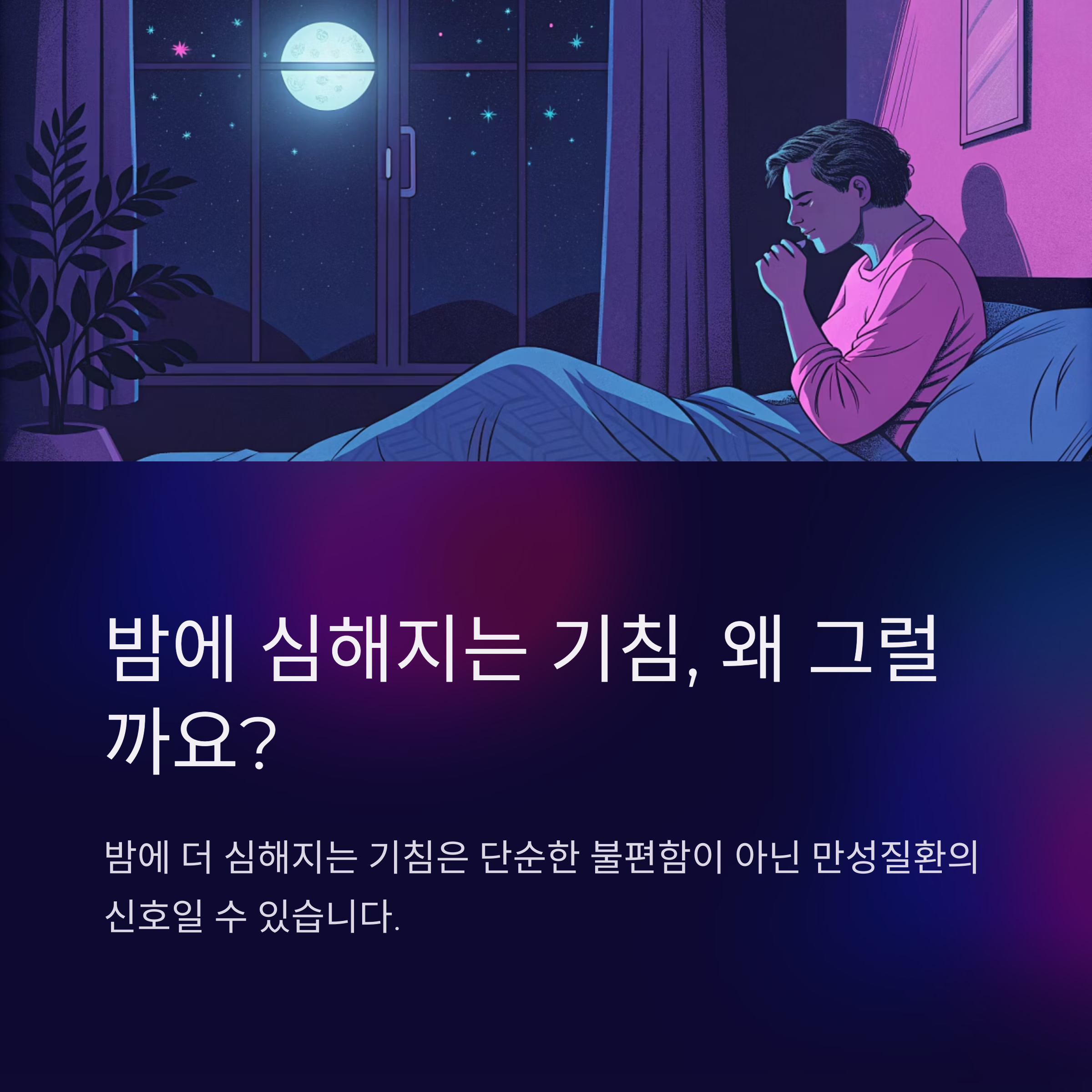 기침은 단순히 목이 간지러워서 나오는 증상이 아닙니다. 특히 밤에 더 심해지는 경향이 있으며, 이는 단순한 불편함을 넘어 만성질환으로 악화될 위험이 있습니다. 본 글에서는 밤 기침이 심해지는 원인부터 만성화 예방을 위한 실질적 방법, 기침으로 인한 합병증까지 구체적으로 정리해드립니다. 잠 못 이루는 밤, 이제 그 원인을 바로잡아야 할 때입니다.
