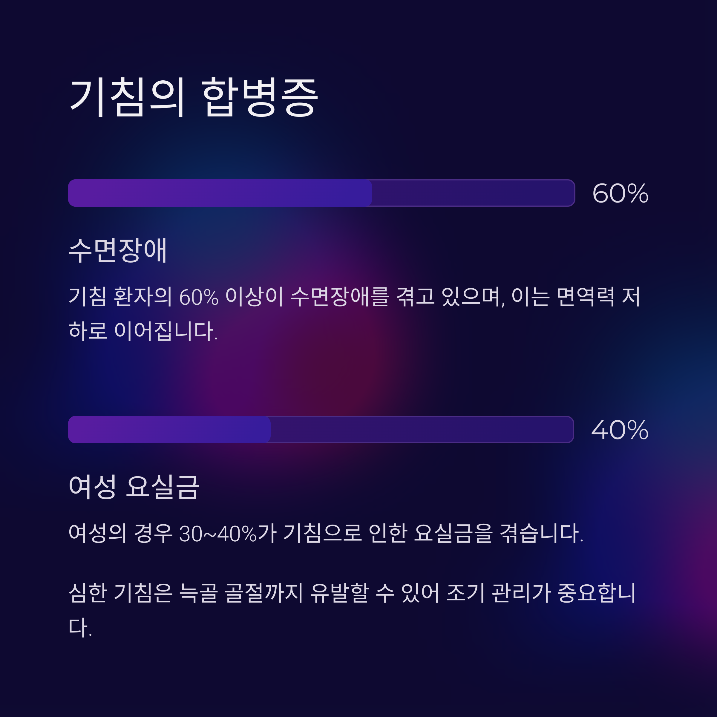 실제로 교대 근무자나 수면장애 환자에서 만성 기침, 천식 유병률이 일반인보다 최대 2배까지 높게 나타납니다.