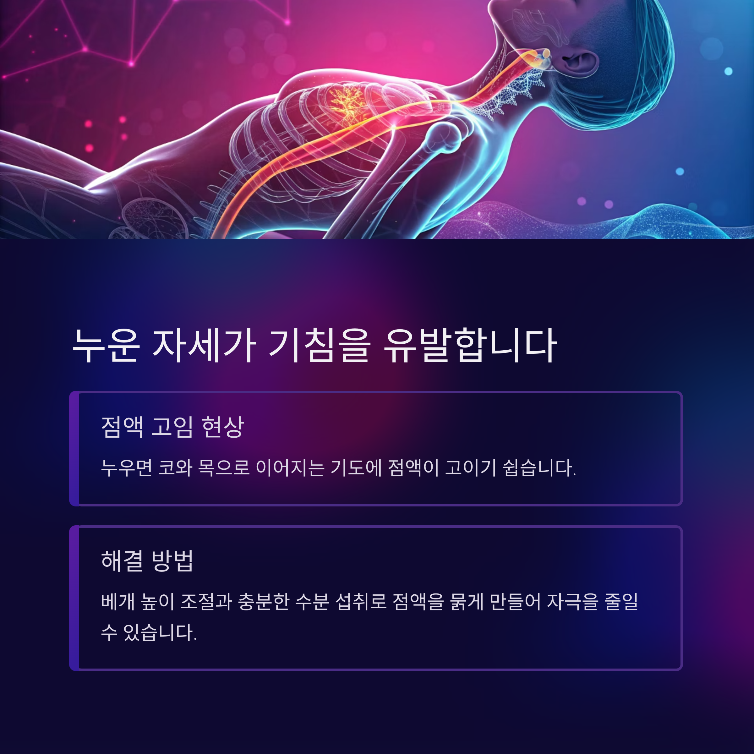 베개 높이를 조절하거나, 수분 섭취로 점액을 묽게 만들어 이 자극을 줄일 수 있습니다.