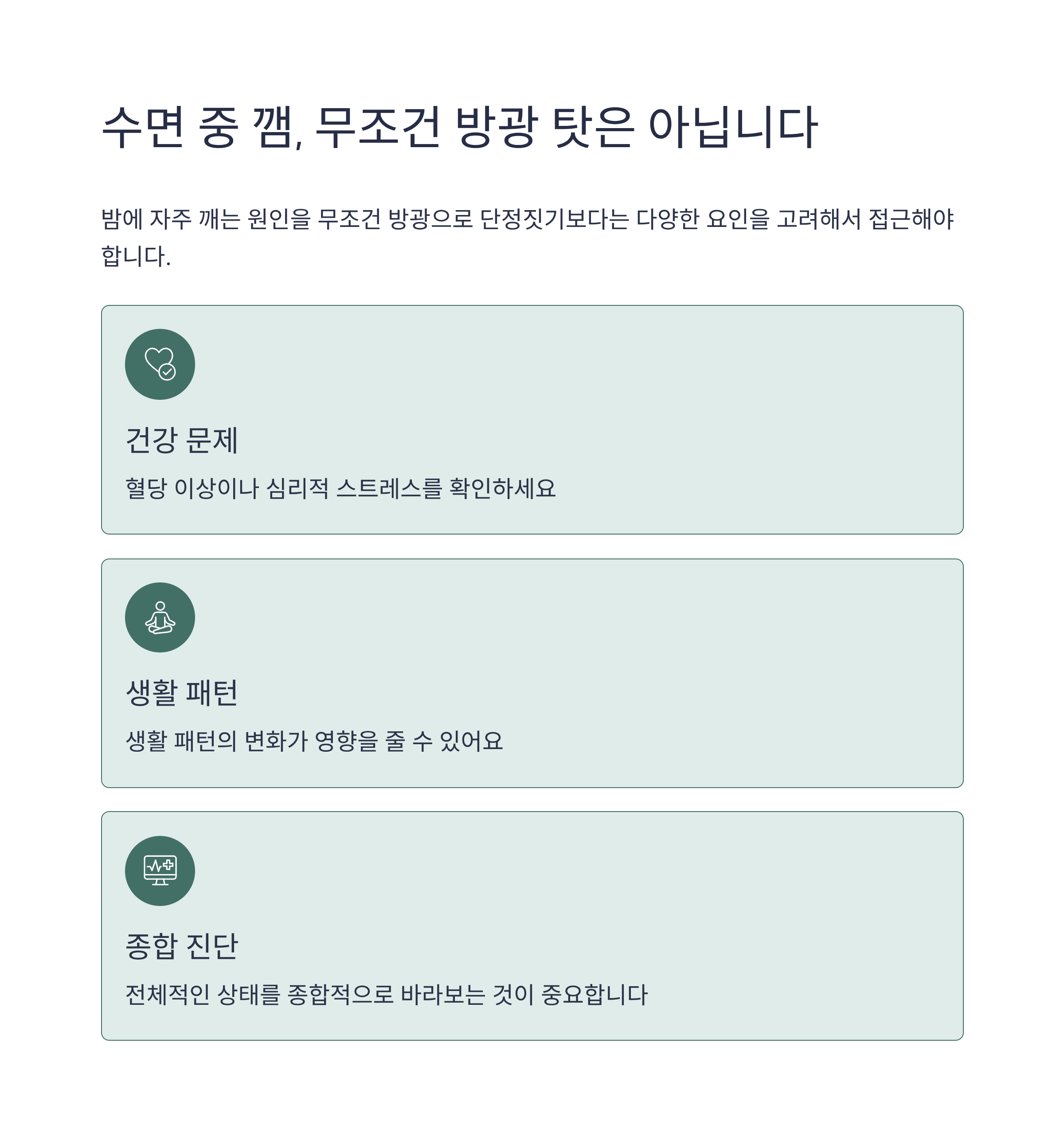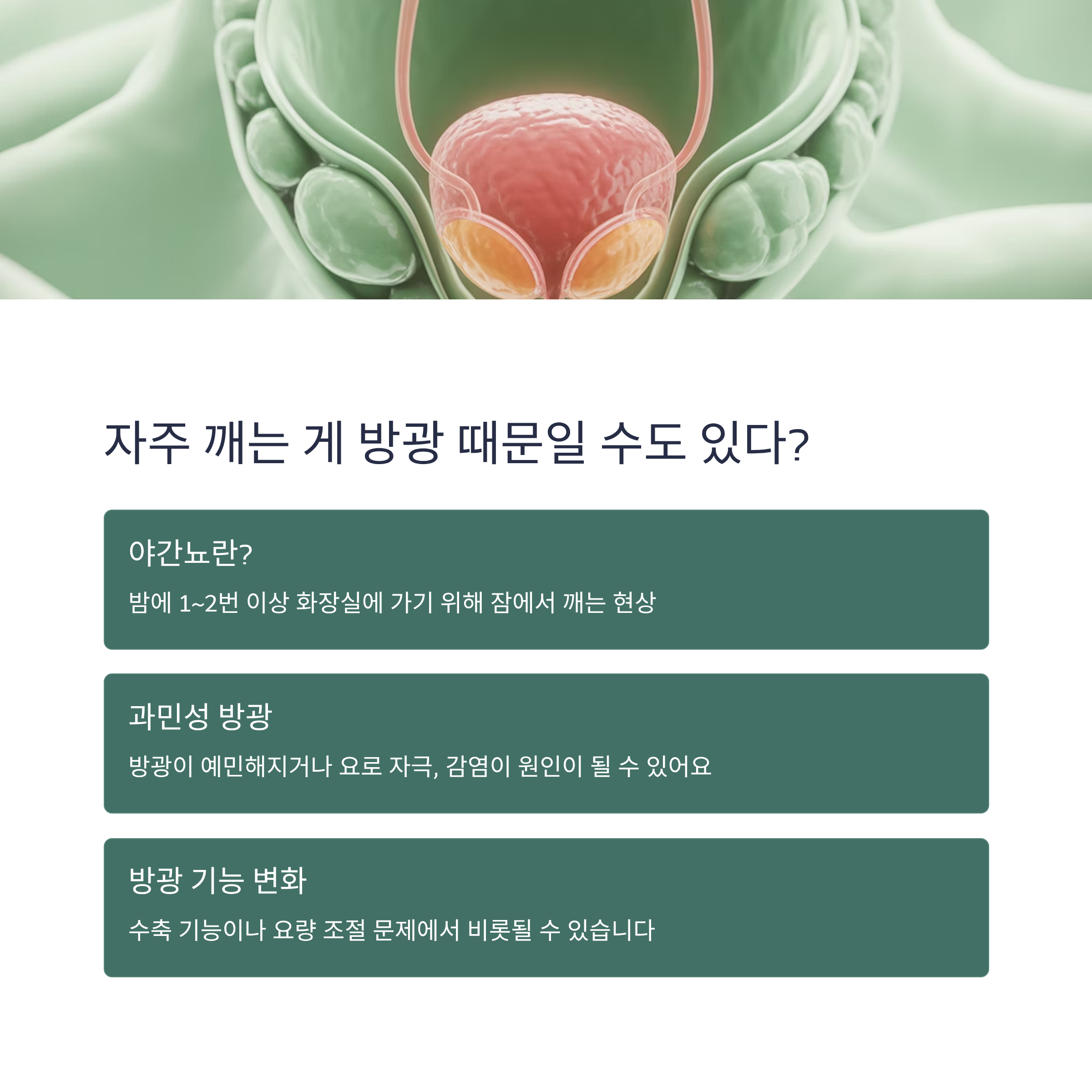 결론적으로, 밤에 자주 깨는 원인을 무조건 방광으로 단정짓기보다는 다양한 요인을 고려해서 접근해야 합니다.