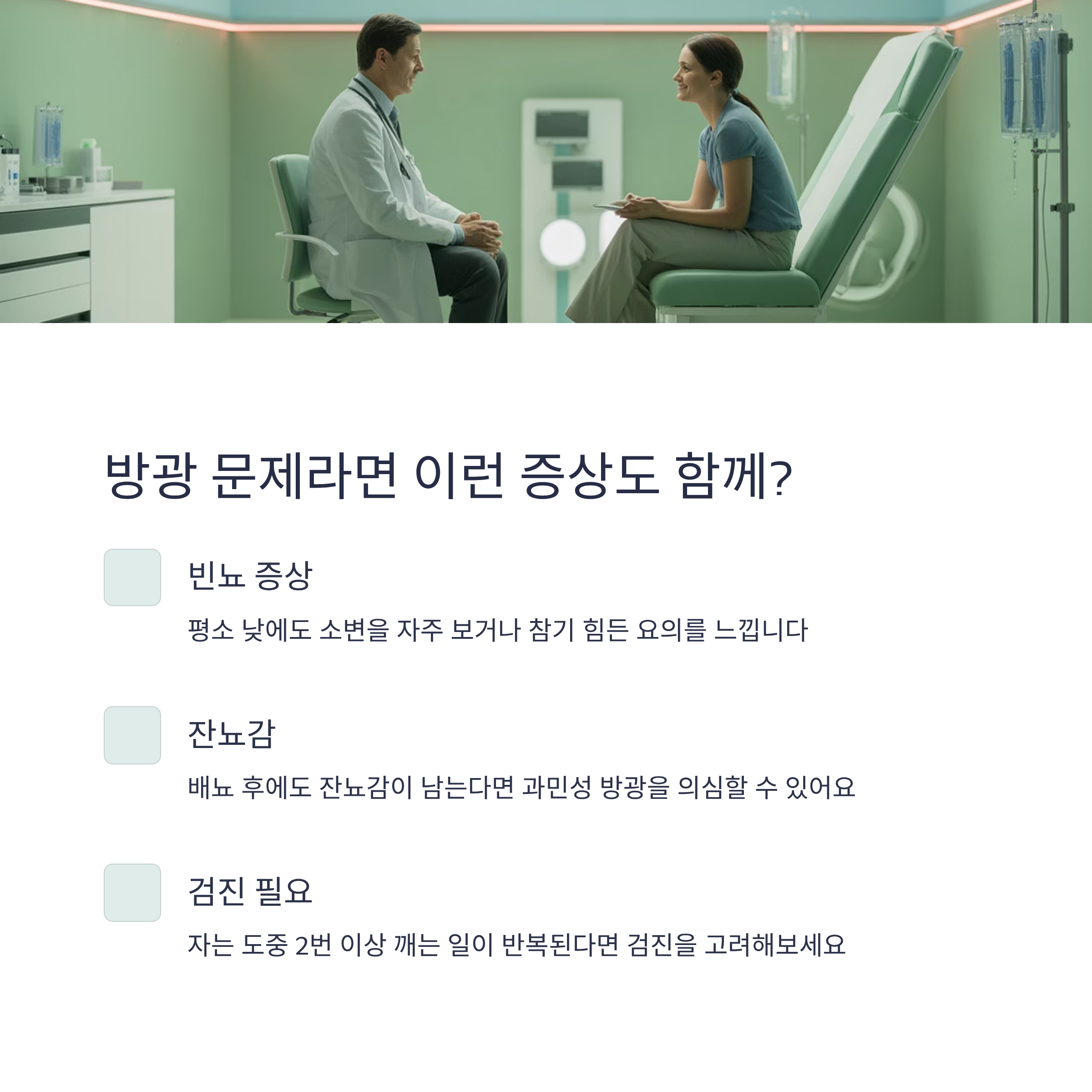 밤에 자주 깨는 것 외에도 평소 낮에도 소변을 자주 보거나, 참기 힘든 요의를 느끼거나, 배뇨 후에도 잔뇨감이 남는다면 과민성 방광 증상을 의심할 수 있어요.