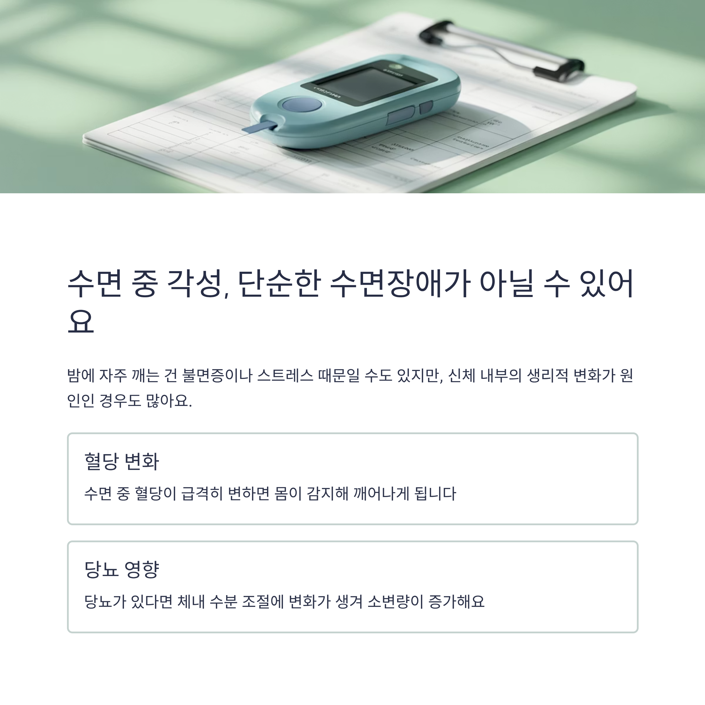 밤에 자주 깨는 건 단순한 불면증이나 스트레스 때문일 수도 있지만, 신체 내부의 생리적 변화가 원인이 되는 경우도 적지 않아요. 특히 수면 중 혈당이 급격히 떨어지거나 올라가면 우리 몸은 그것을 감지해 깨어나게 됩니다.