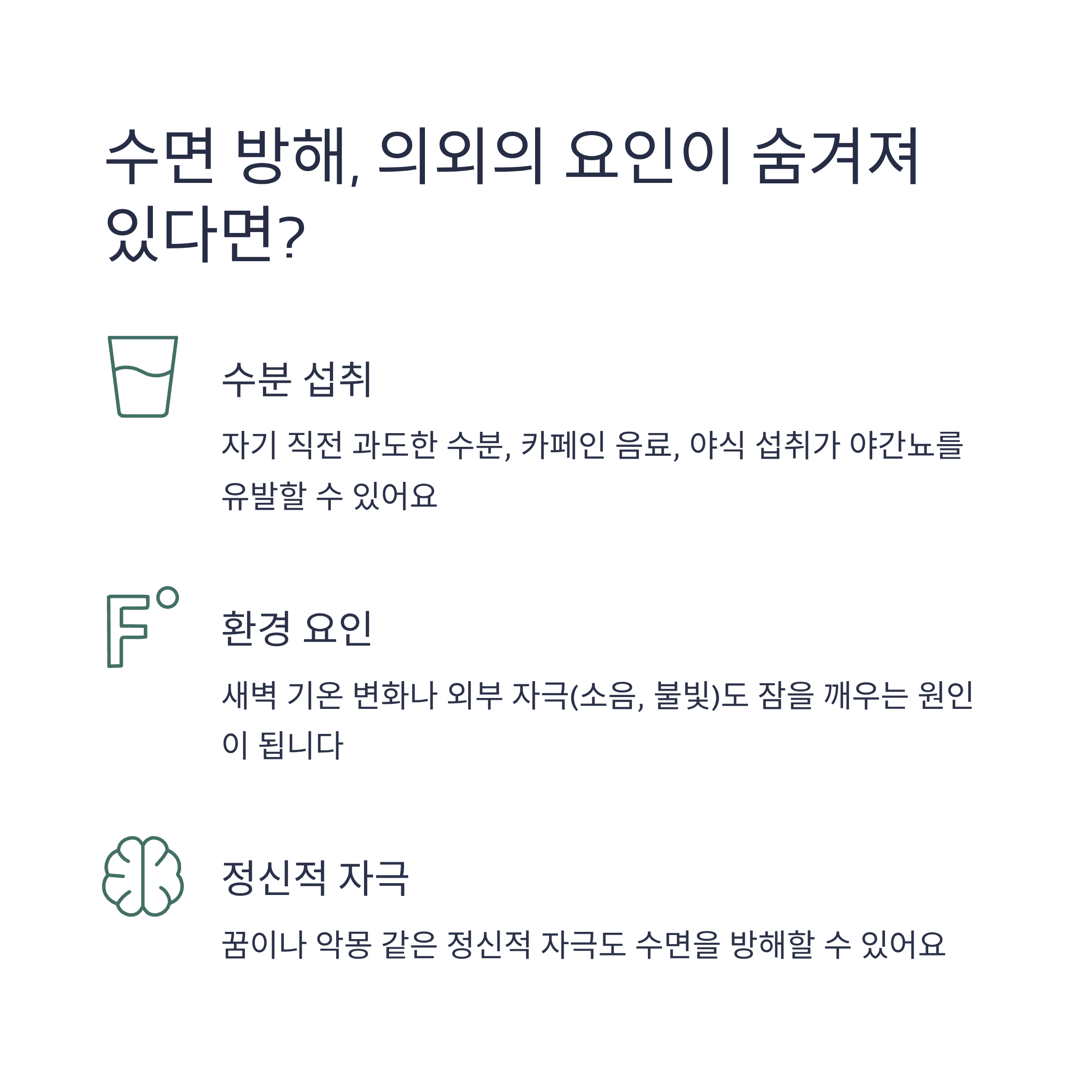 생각보다 단순한 요인, 예를 들어 자기 직전 과도한 수분 섭취, 카페인 음료, 혹은 야식 섭취도 수면을 방해하고 야간뇨를 유발할 수 있습니다. 이외에도 새벽 기온 변화나 외부 자극(소음, 불빛 등), 심지어 꿈이나 악몽 등 정신적 자극도 잠을 깨우는 원인이 될 수 있어요.