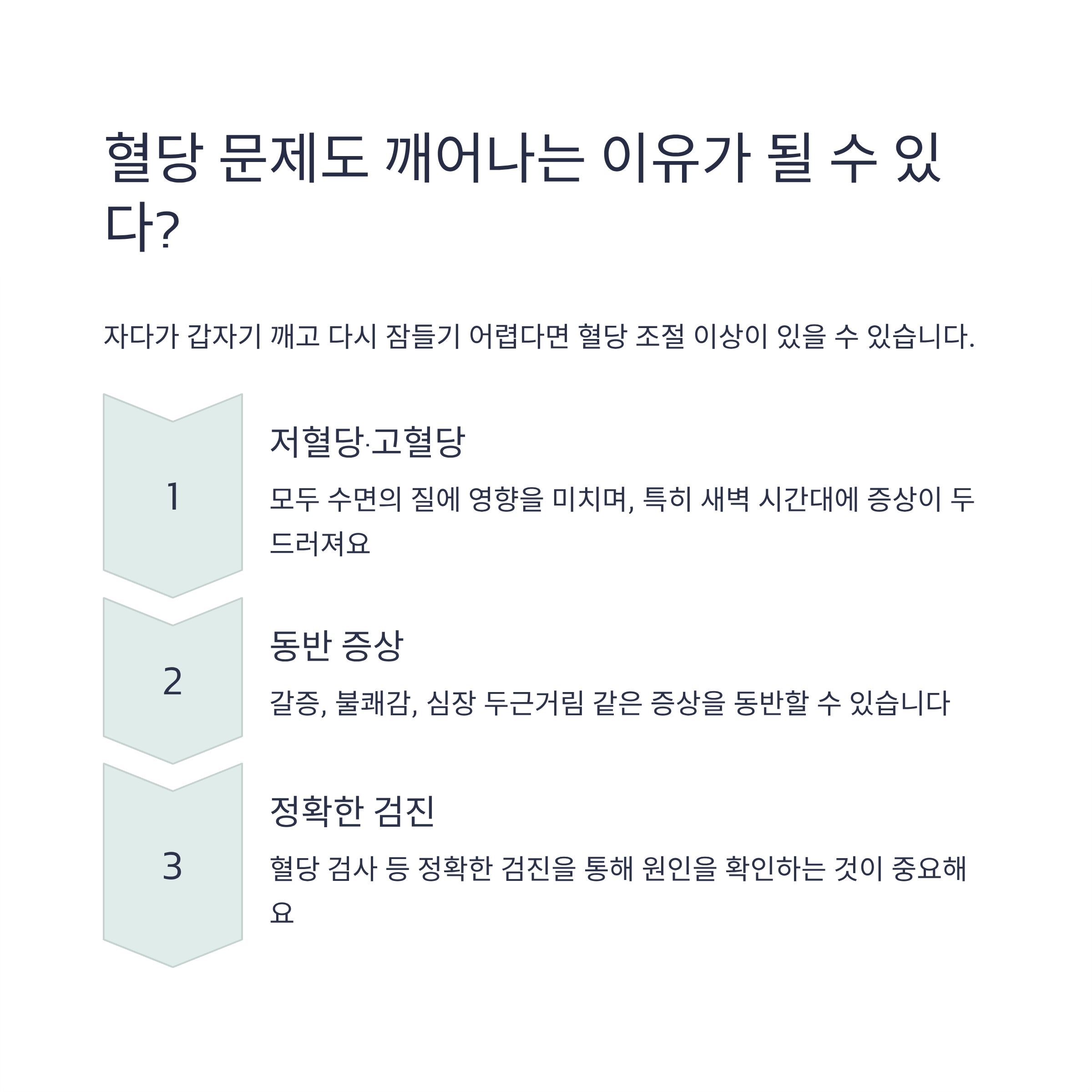 자다가 갑자기 깨고, 그 이후 잠이 잘 들지 않는 경우, 혈당 조절 이상이 있을 수도 있습니다. 저혈당이나 고혈당 모두 수면의 질에 영향을 미치며, 특히 새벽 시간대에 증상이 두드러질 수 있어요.