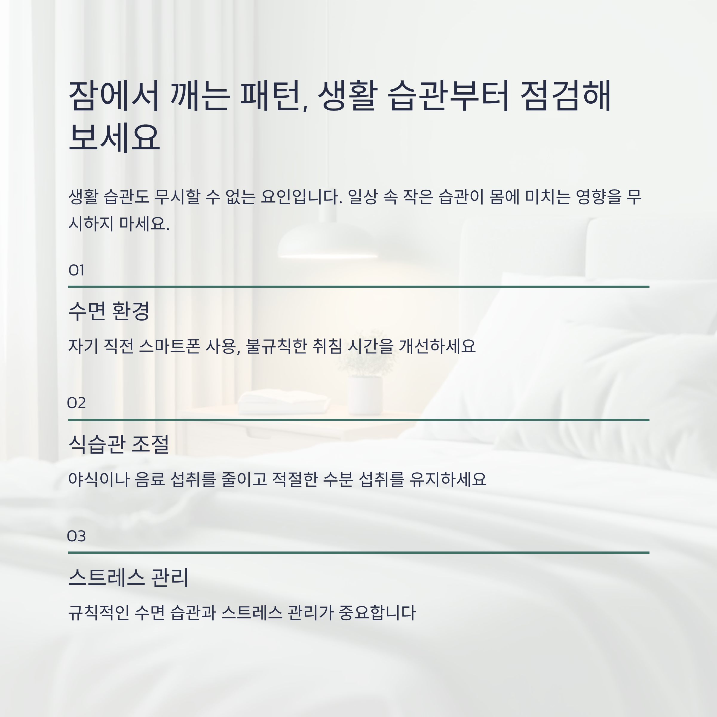생활 습관도 무시할 수 없는 요인입니다. 평소 자기 직전 스마트폰 사용, 불규칙한 취침 시간, 야식이나 음료 섭취 등도 수면의 질을 떨어뜨리고 중간에 깨게 만드는 주범이 될 수 있어요.
