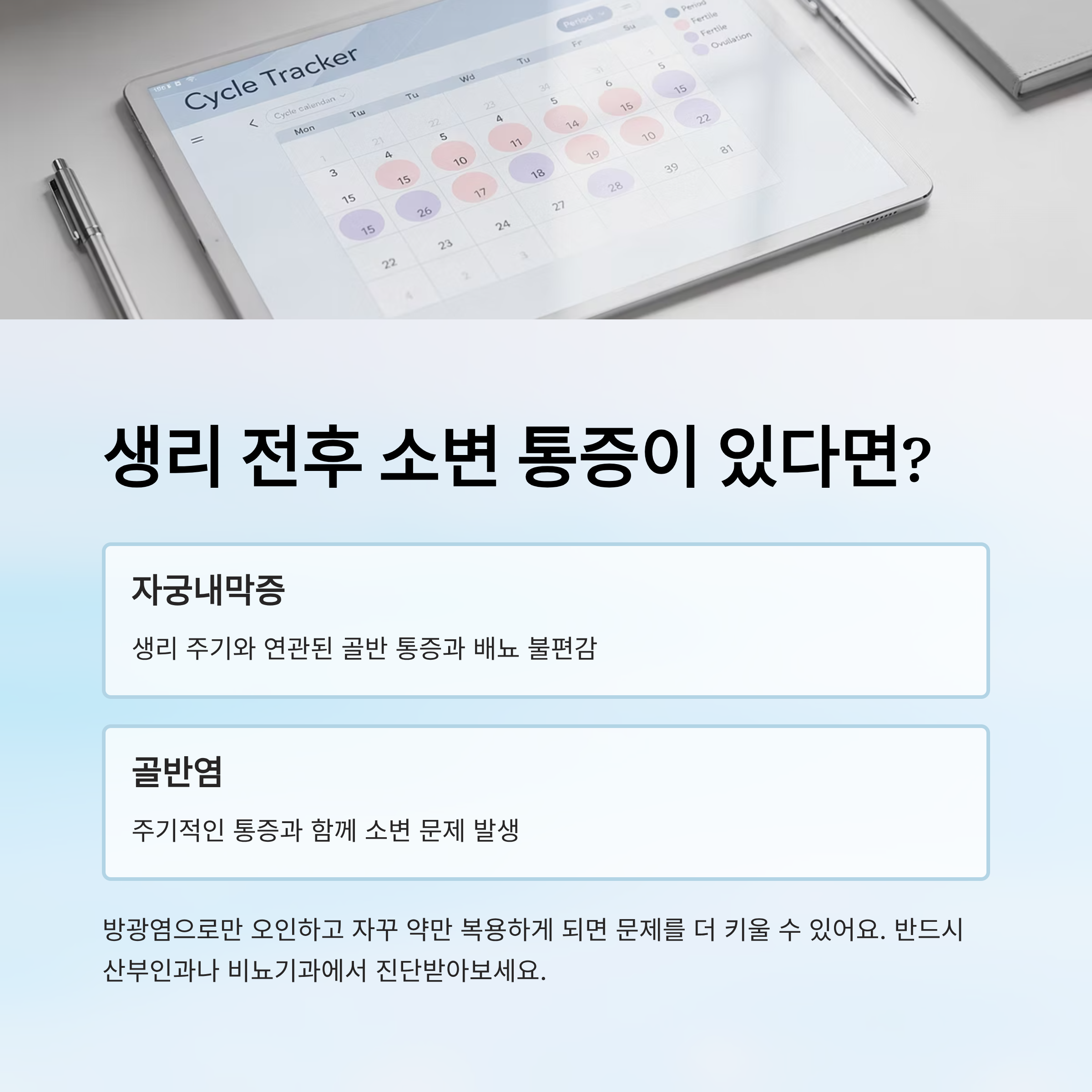 - 생리 전후로 주기적인 증상이 반복된다