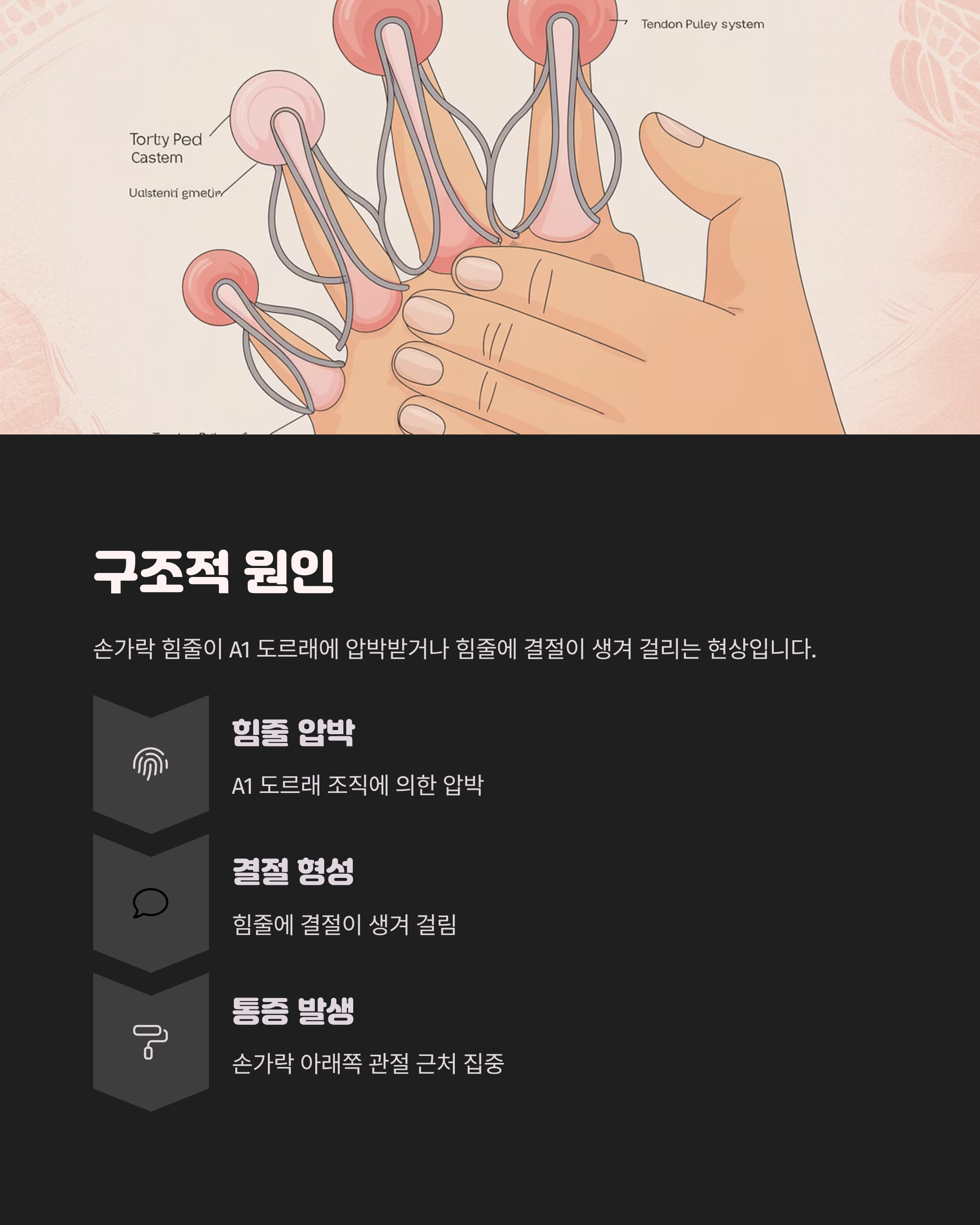 이때 통증은 힘줄과 도르래가 맞닿는 부위에서 발생하며, 주로 손가락 아래쪽 관절 근처에서 두드러집니다. 구조적으로 문제가 생기면 움직일 때마다 힘줄이 지나가는 위치에 자극이 반복되며, 결국 통증이 심화되죠.