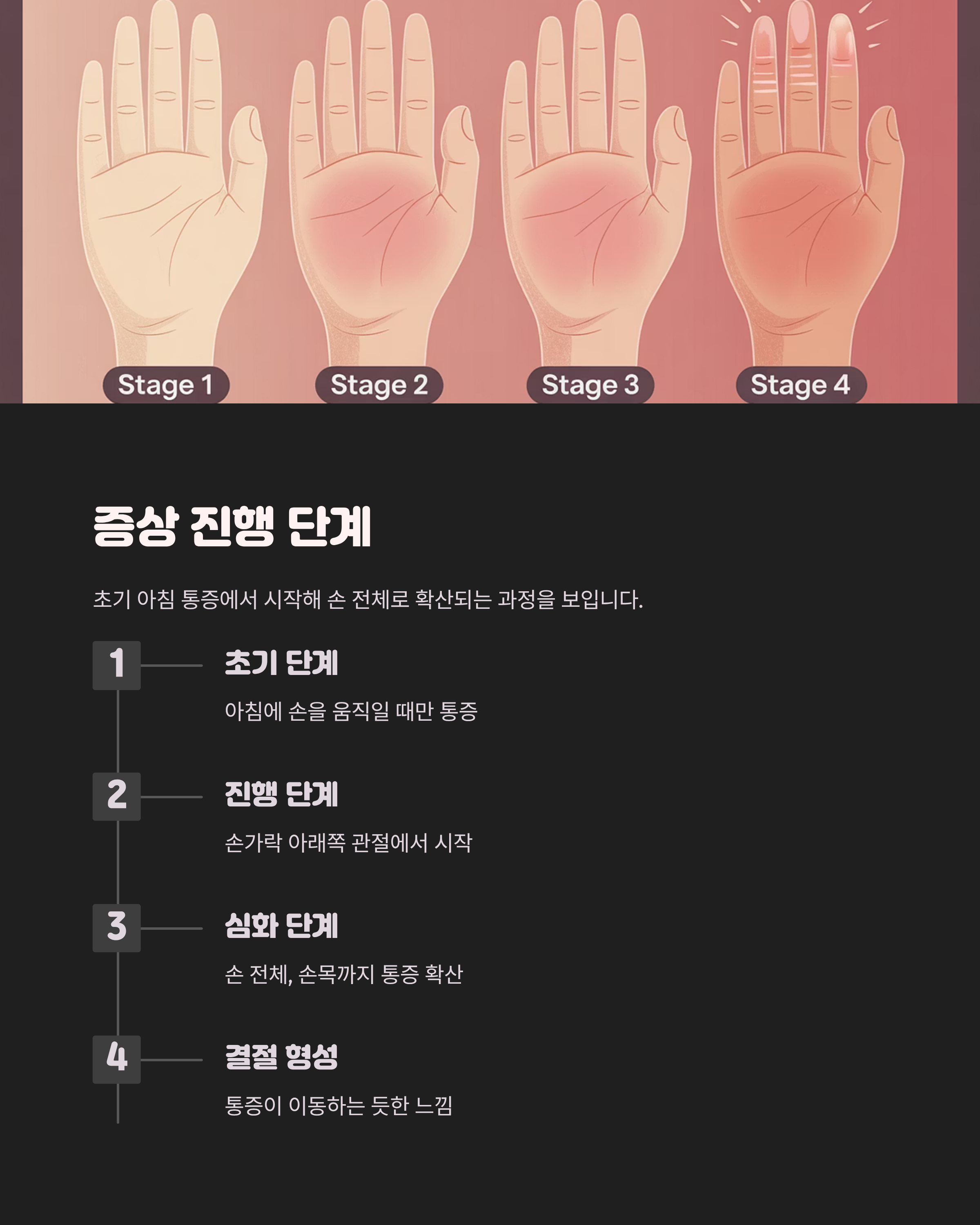 초기엔 아침에 손을 움직일 때만 아픈 느낌이 들 수 있습니다.