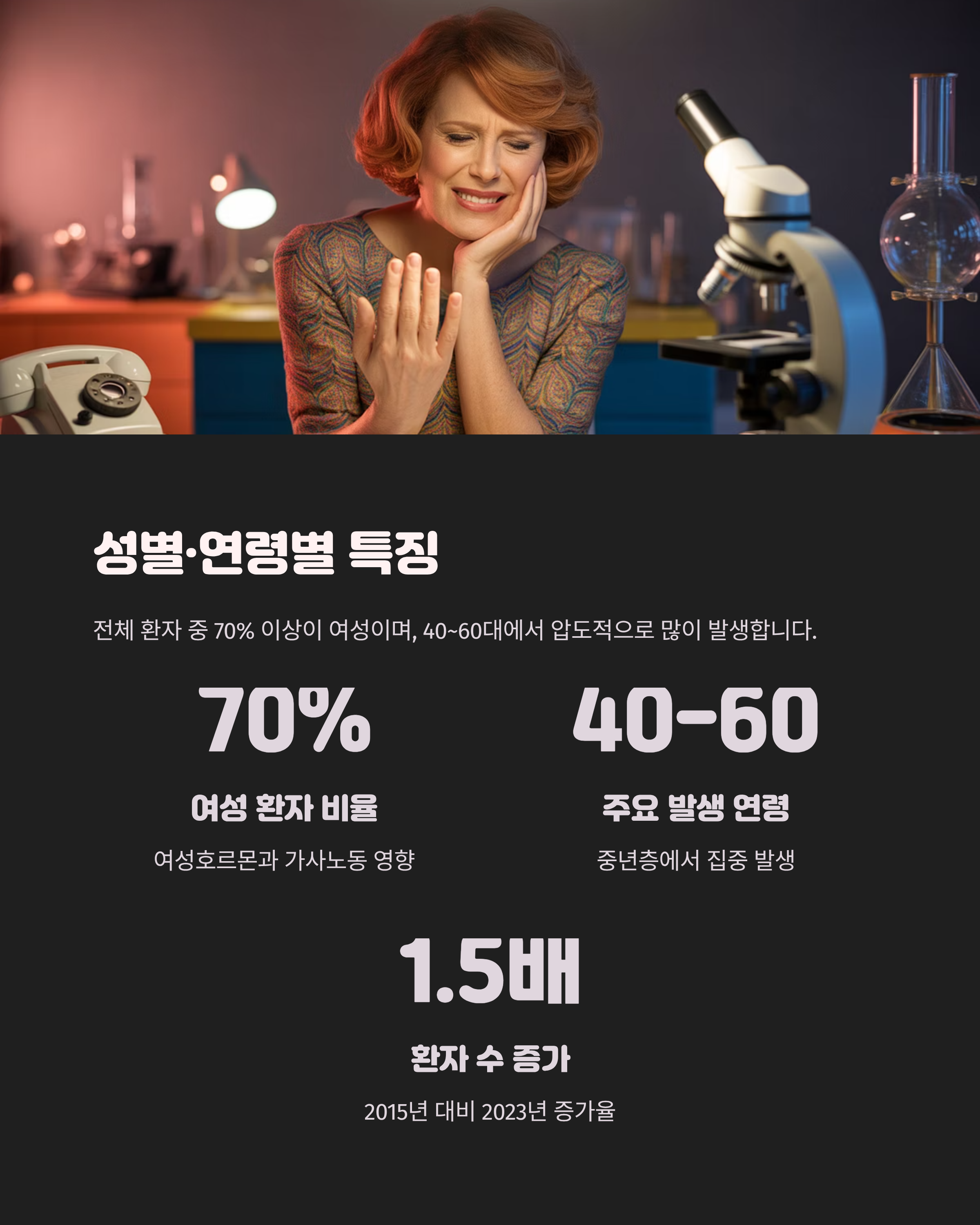 전체 환자 중 약 70% 이상이 여성이며, 특히 40대~60대 중년층에서 압도적으로 많이 발생합니다.