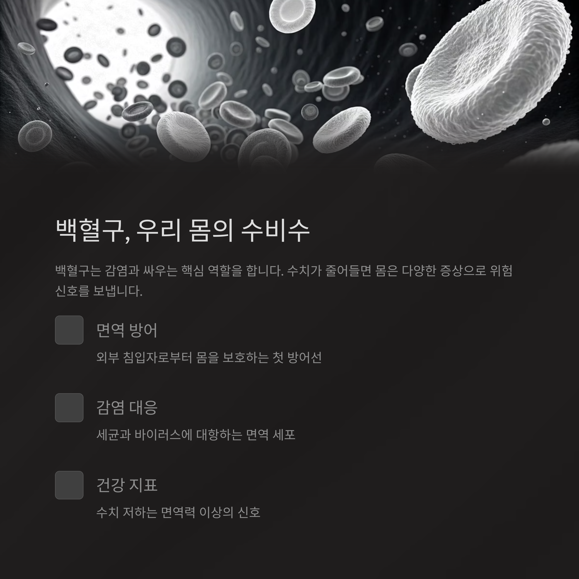 백혈구는 감염과 싸우는 역할을 하며, 그 수치가 줄어들면 몸은 다양한 증상을 통해 위험을 알립니다.