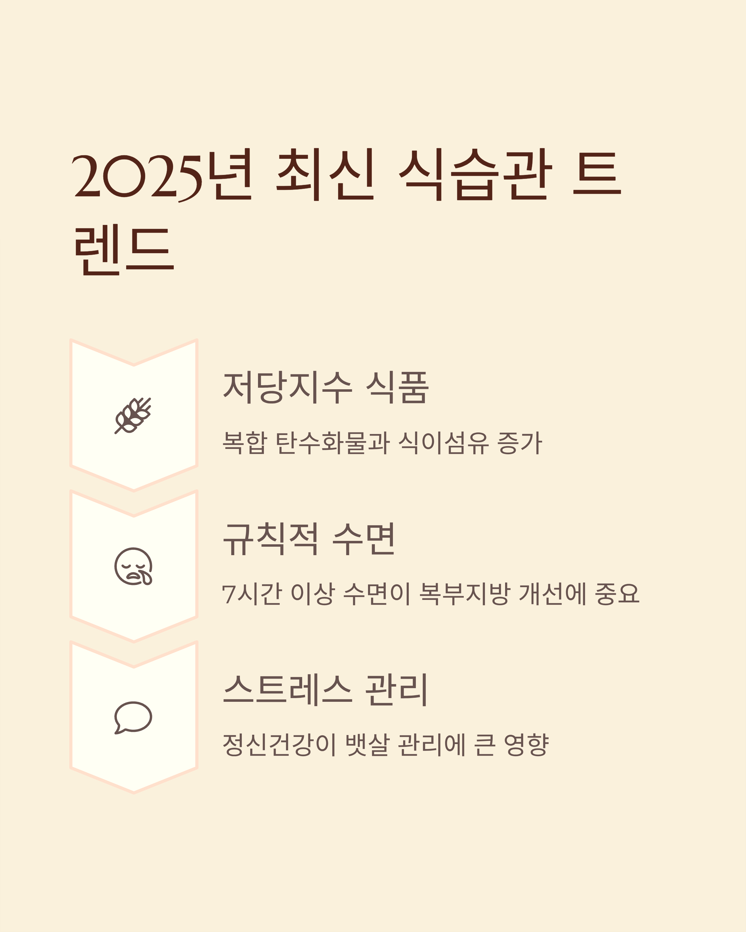 올해 발표된 건강보고서에 따르면, 고당지수 식품 섭취 대신 저당지수 복합 탄수화물과 식이섬유를 늘리는 식습관이 중요하다고 합니다. 특히 규칙적인 수면 7시간 이상과 스트레스 관리가 복부지방 개선에 큰 영향을 준다는 점도 강조됩니다.