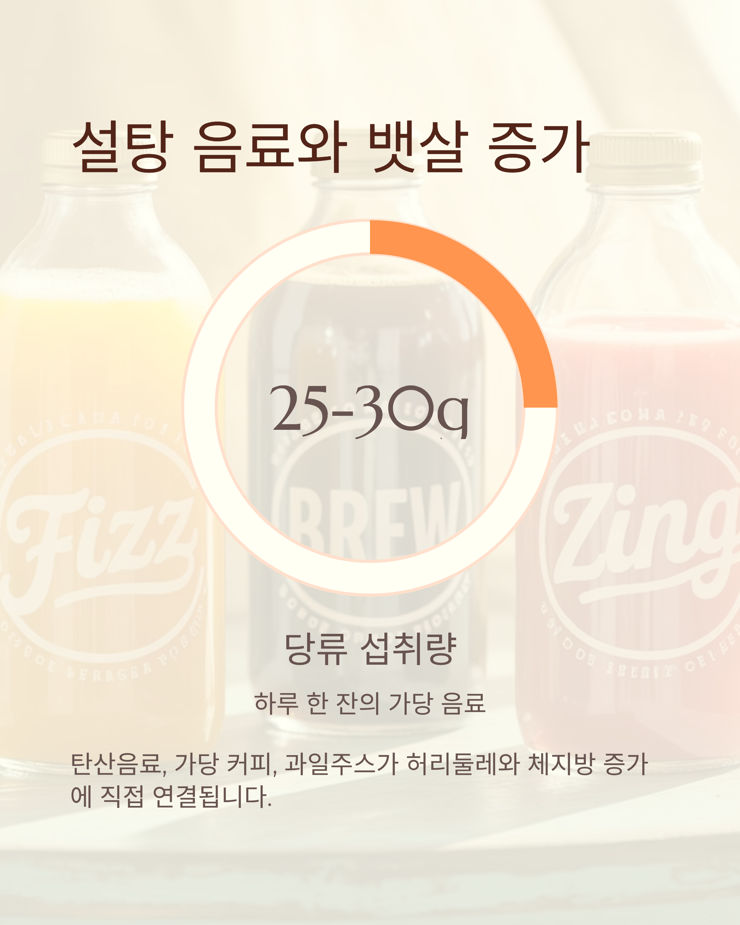 탄산음료나 가당 커피, 과일주스는 하루 한 잔만 마셔도 당류 섭취량이 25g~30g에 이릅니다. 연구에서는 이러한 음료가 허리둘레와 체지방 증가와 직접적으로 연결된다고 밝혔습니다.