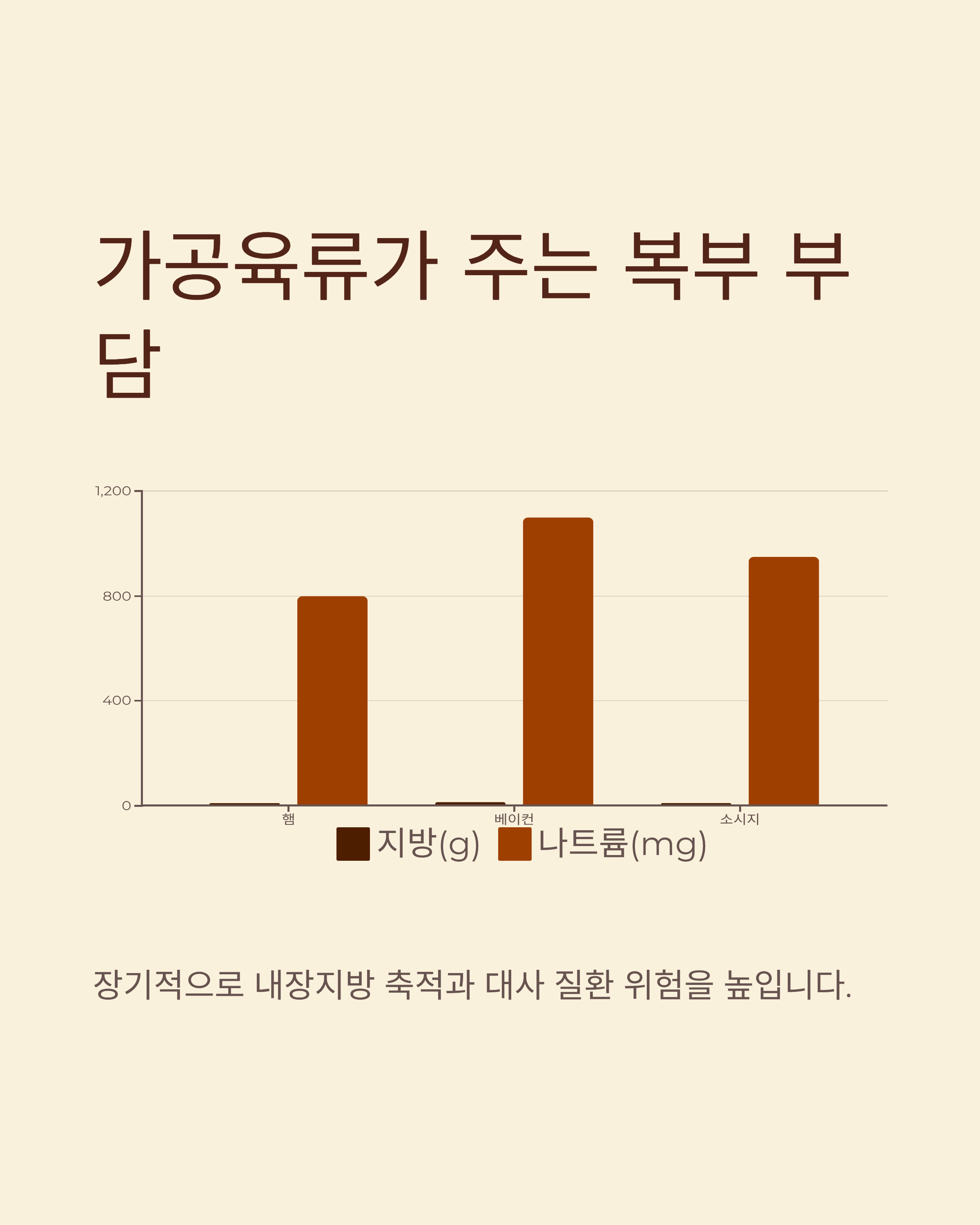 햄, 베이컨, 소시지와 같은 가공육은 100g당 지방 8~12g, 나트륨 800mg~1100mg을 포함합니다. 장기적으로는 내장지방 축적과 대사 질환 위험을 함께 높이는 요소로 지목됩니다.