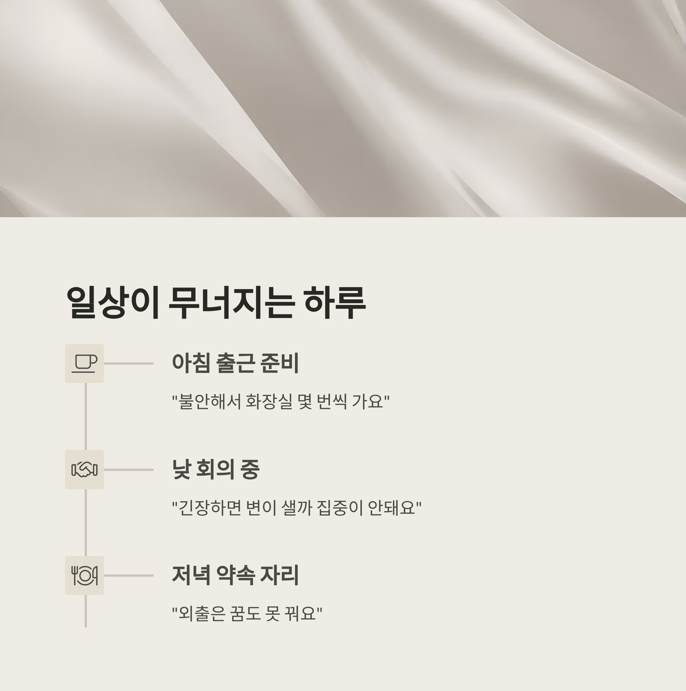 | 아침 | 출근 준비 중 | "불안해서 화장실 몇 번씩 가요" |