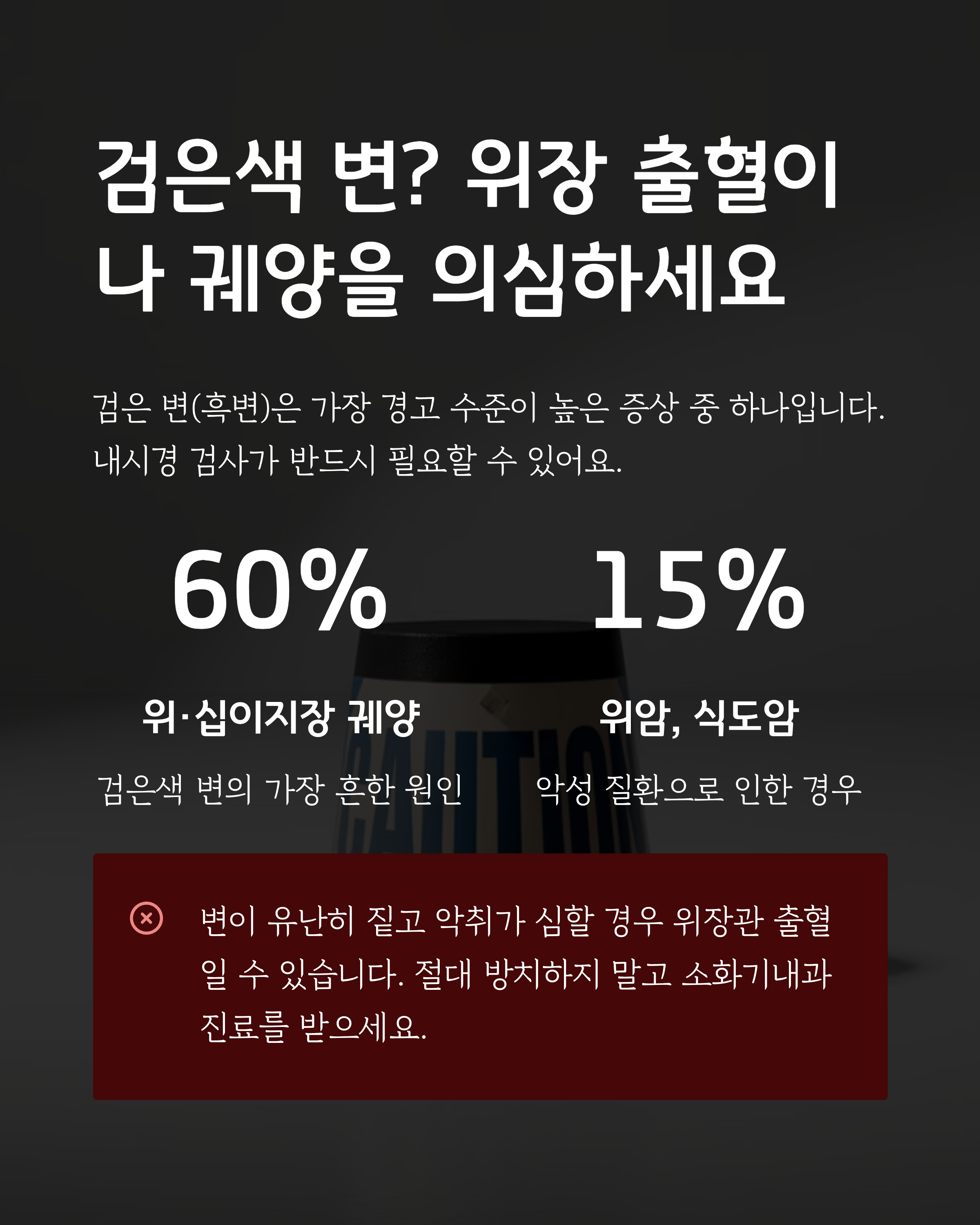검은 변(흑변)은 가장 경고 수준이 높은 증상 중 하나입니다.
