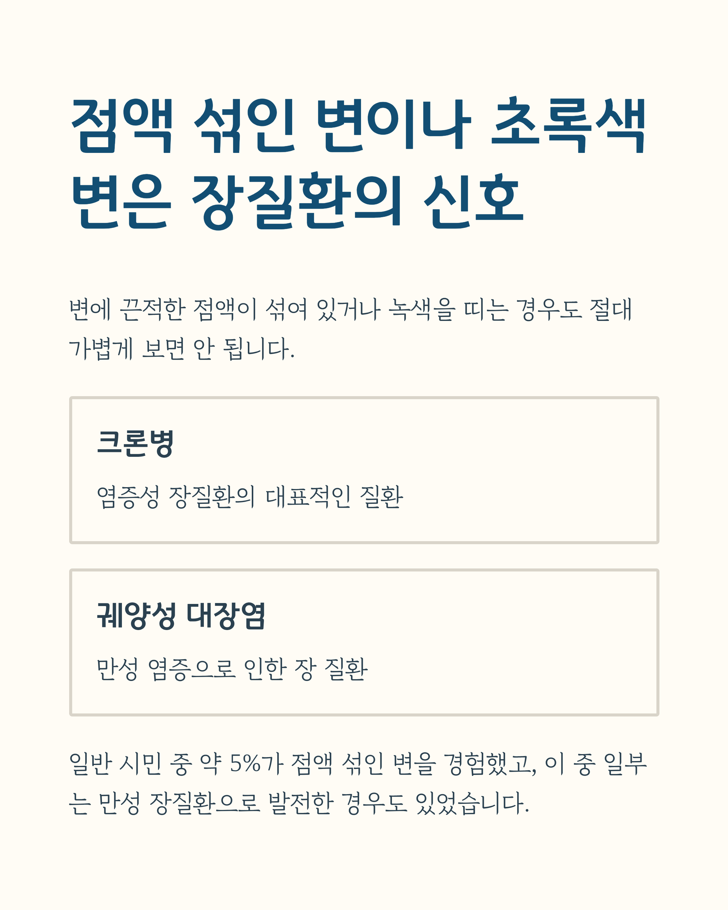 이런 변은 크론병, 궤양성 대장염 같은 염증성 장질환과 관련 있을 수 있어요.