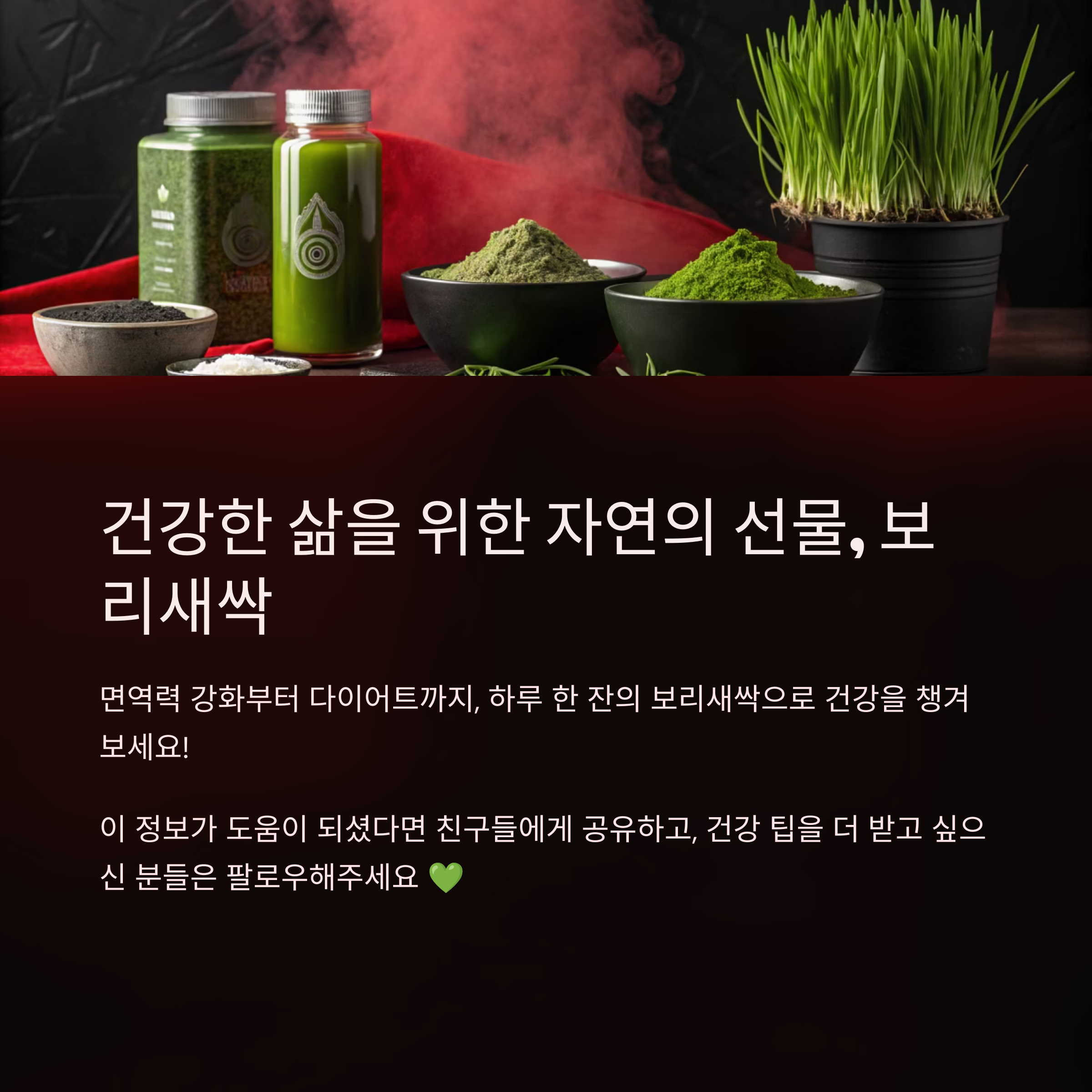 보리새싹은 영양성분이 풍부하여 면역력 강화, 간 기능 개선, 콜레스테롤 조절, 피부 건강 등에 뛰어난 효과를 보여줍니다. 특히 폴리코사놀, 사포나린, 베타글루칸 등의 기능성 물질이 고함량으로 포함되어 있어 다양한 현대인 질환 예방에 도움을 줍니다. 단, 섭취량 조절이 중요하며, 신장질환자나 임산부는 주의가 필요합니다.