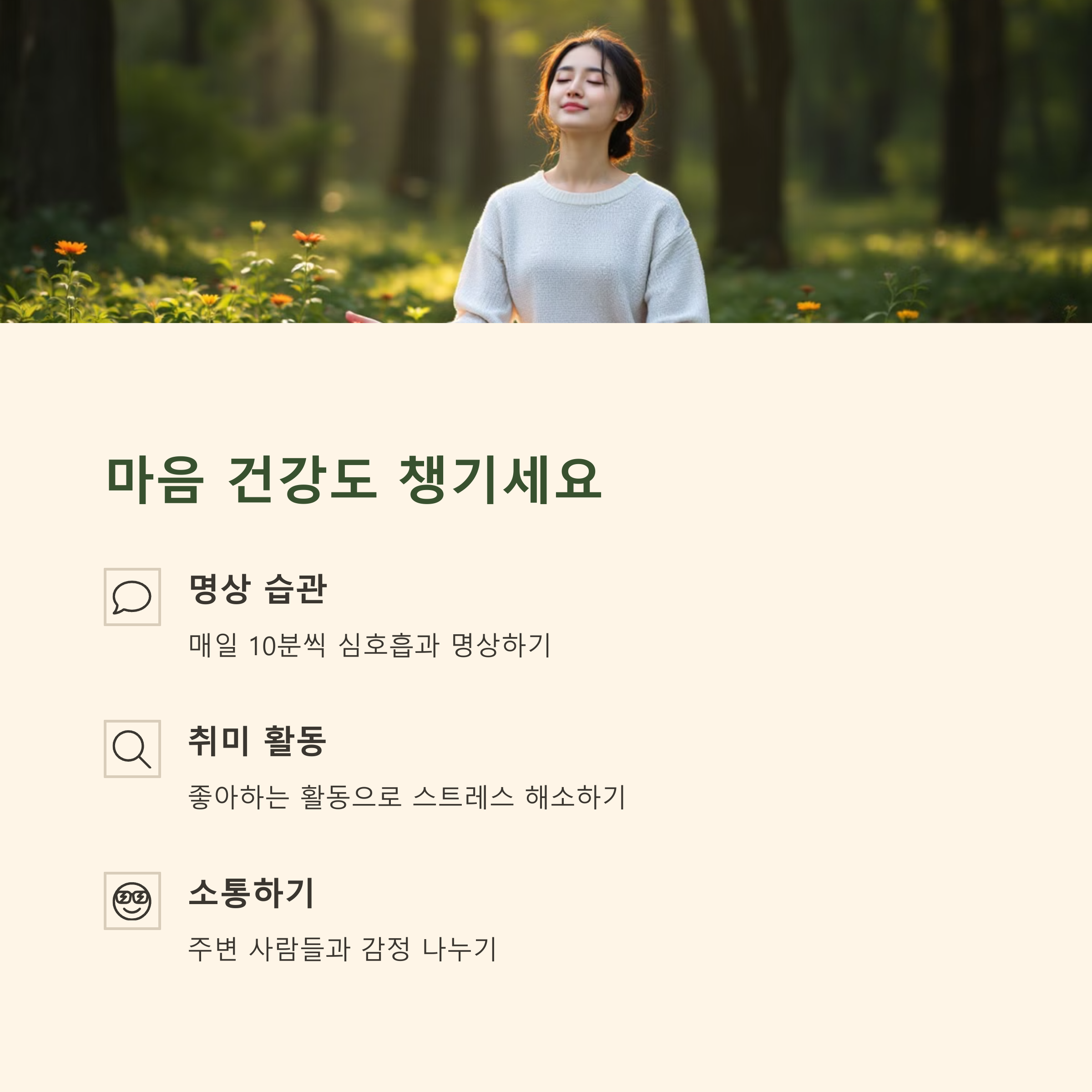 정신 건강은 신체 건강만큼 중요한 요소입니다. 사실 정신적인 스트레스와 불안은 우리의 신체 건강에 큰 영향을 미칠 수 있죠. 스트레스를 관리하고, 긍정적인 생각을 유지하는 것은 전체적인 건강에 매우 중요한 역할을 합니다. 매일 명상이나 깊은 호흡을 통해 마음을 가라앉히고, 정신적으로 안정감을 찾는 것이 중요합니다.