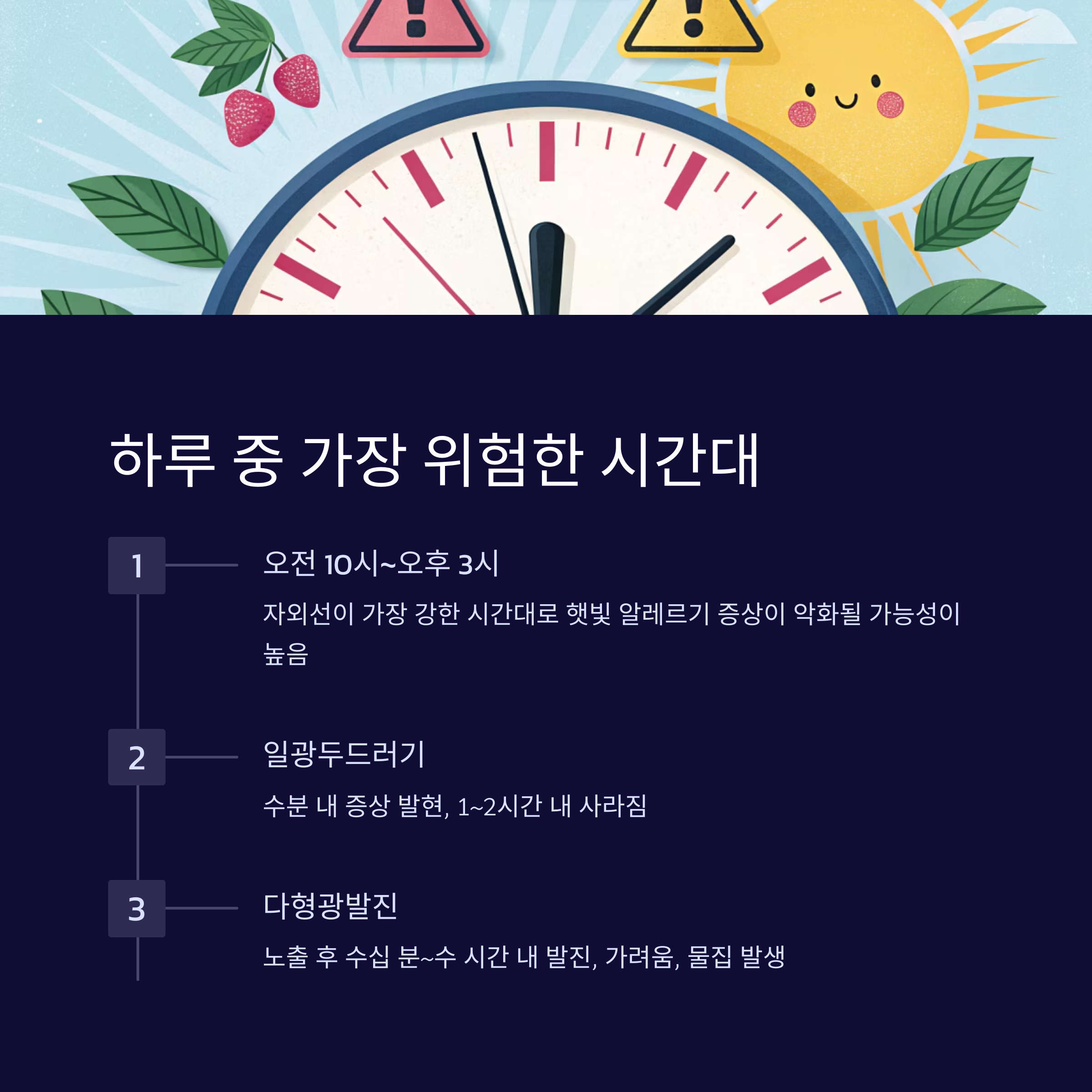 햇빛 알레르기는 계절과 시간, 자외선 강도에 따라 증상이 달라지며 특히 봄부터 여름 사이 심화됩니다. 자외선이 강해지는 오전 10시부터 오후 3시까지는 증상이 악화되기 쉬운 시간대이며, 각 증상마다 발현 시기와 지속 시간이 다릅니다. 이번 글에서는 일광두드러기와 다형광발진 등 주요 햇빛 알레르기 유형별로 심해지는 시기와 시간, 관련 데이터를 중심으로 정리해 드리겠습니다.