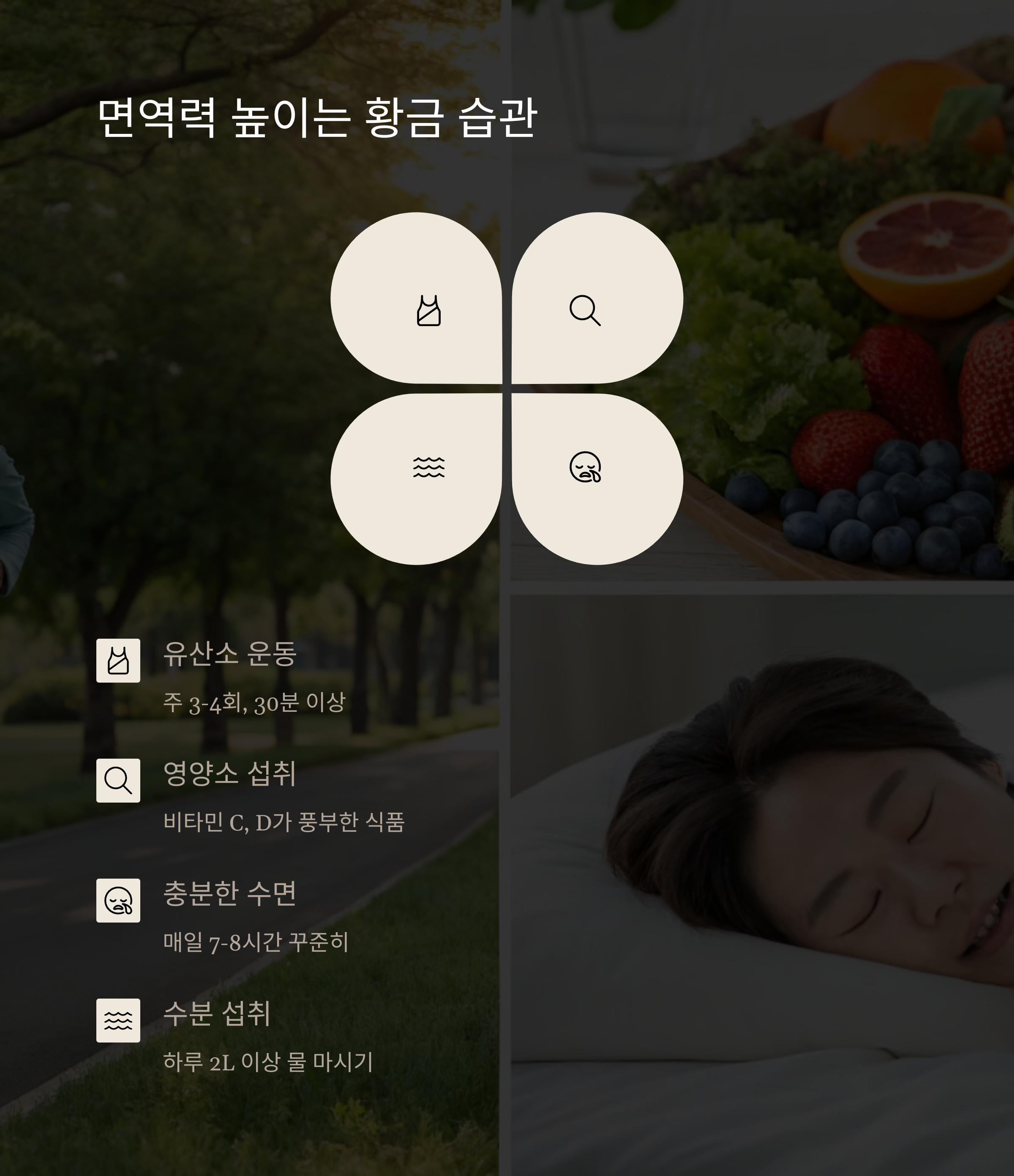 | 꽃가루, 황사, 미세먼지 | 공기 청정기 사용, 창문 닫기 | 유산소 운동, 비타민 섭취 |