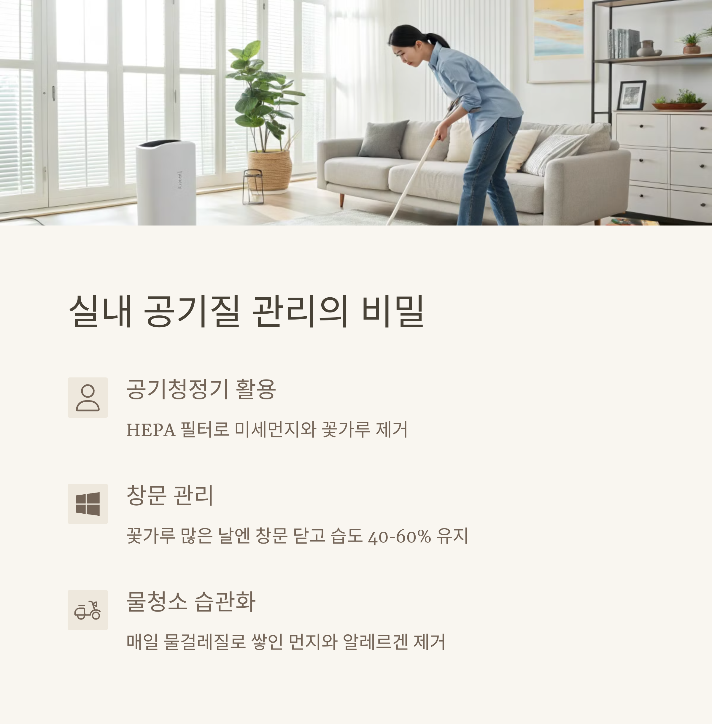 | 알레르기 유발 물질 | 실내 환경 관리 | 생활 습관 개선 |