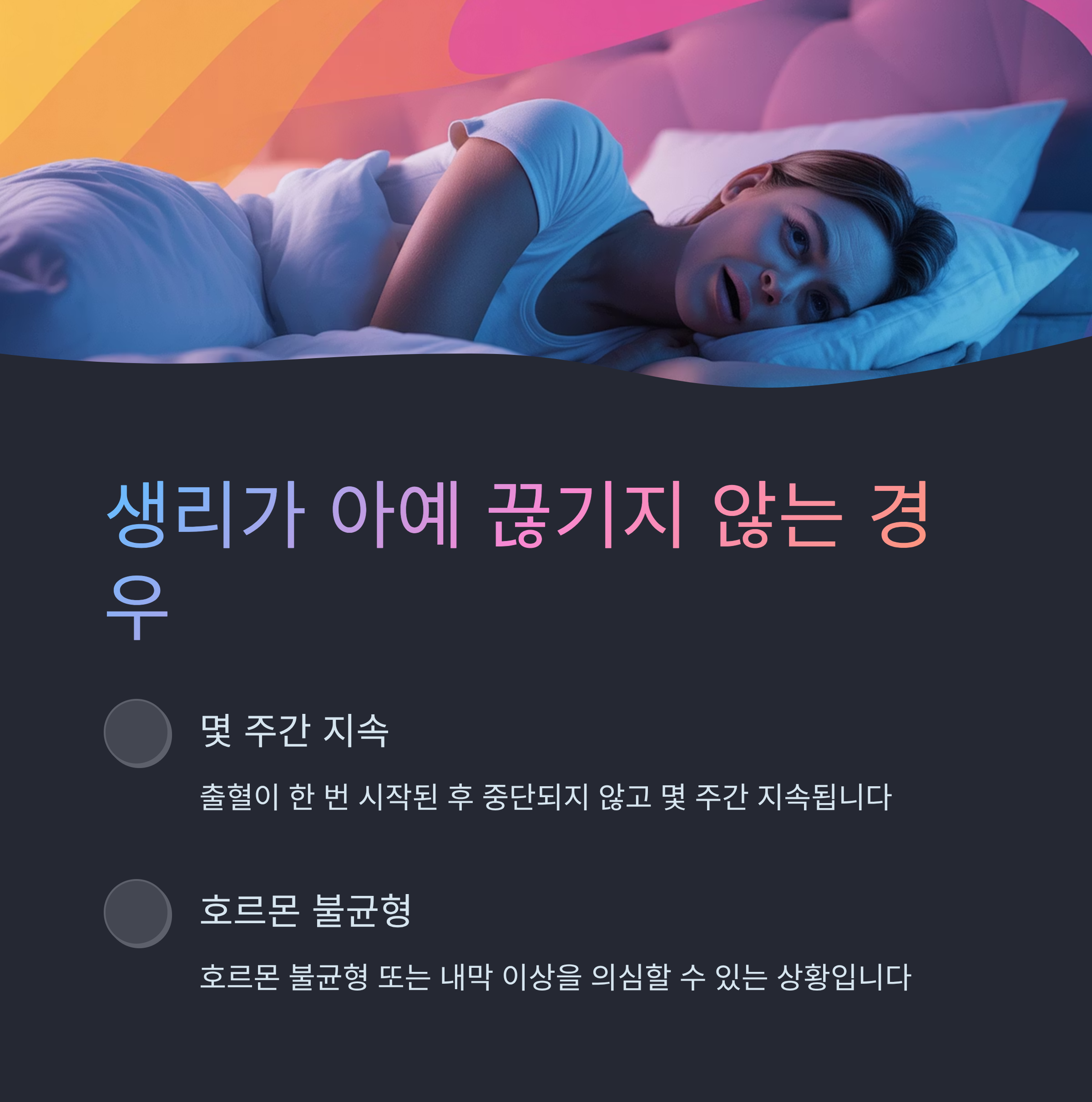 출혈이 한 번 시작된 후 중단되지 않고 몇 주간 지속된다면, 이는 호르몬 불균형 또는 내막 이상을 의심할 수 있는 상황입니다.