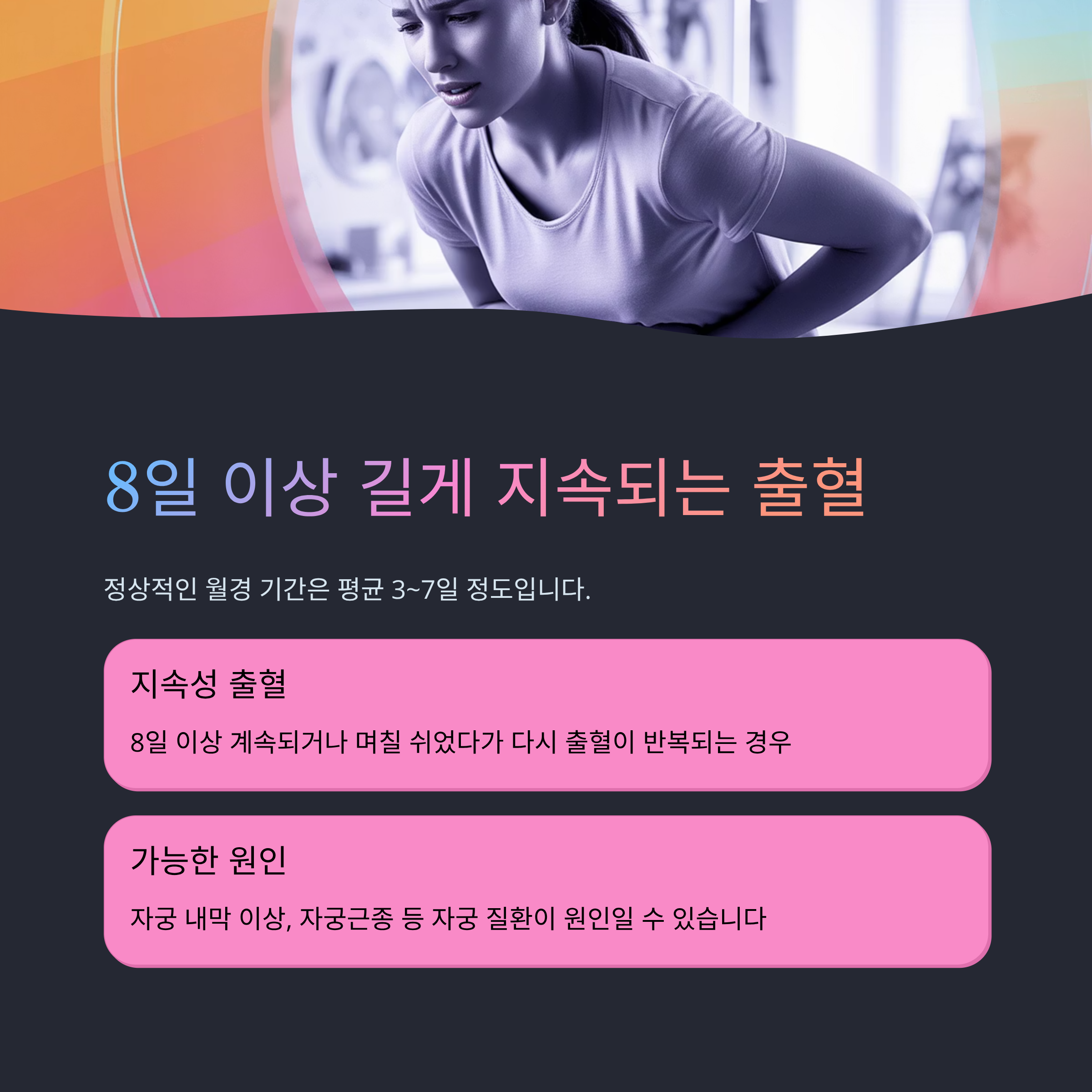 그런데 출혈이 8일 이상 계속되거나, 며칠 쉬었다가 다시 출혈이 반복되는 경우라면 '지속성 출혈'로 간주할 수 있습니다.