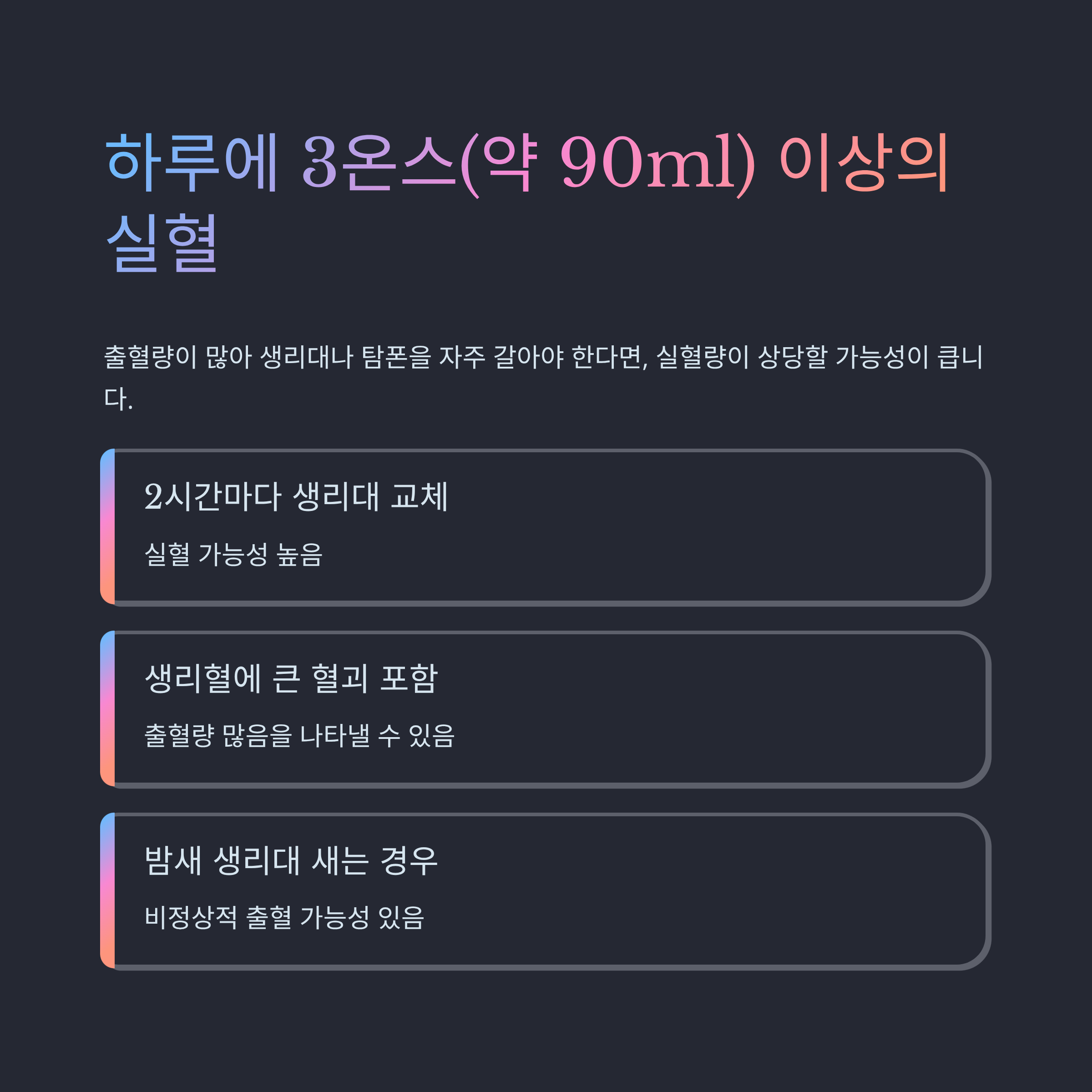 출혈량이 많아 생리대나 탐폰을 자주 갈아야 한다면, 실혈량이 상당할 가능성이 큽니다.
