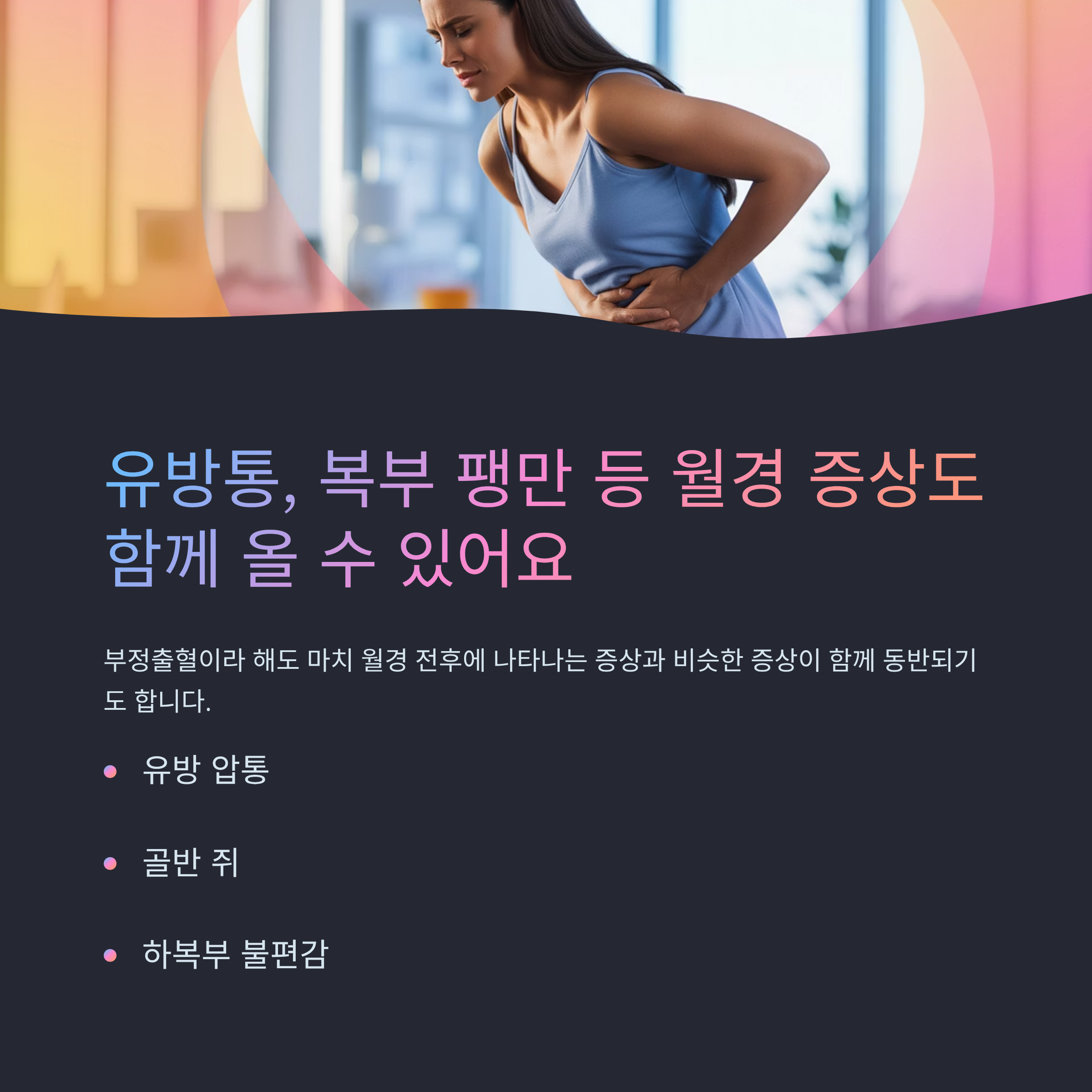 유방통, 복부 팽만 등 월경 증상도 함께 올 수 있어요