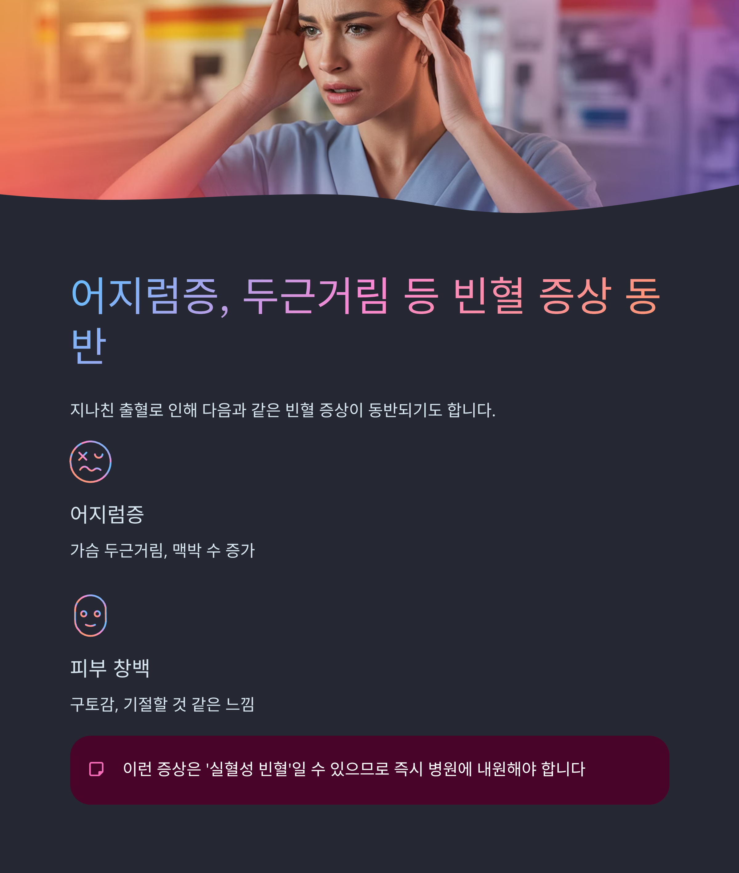 지나친 출혈로 인해 다음과 같은 빈혈 증상이 동반되기도 합니다.