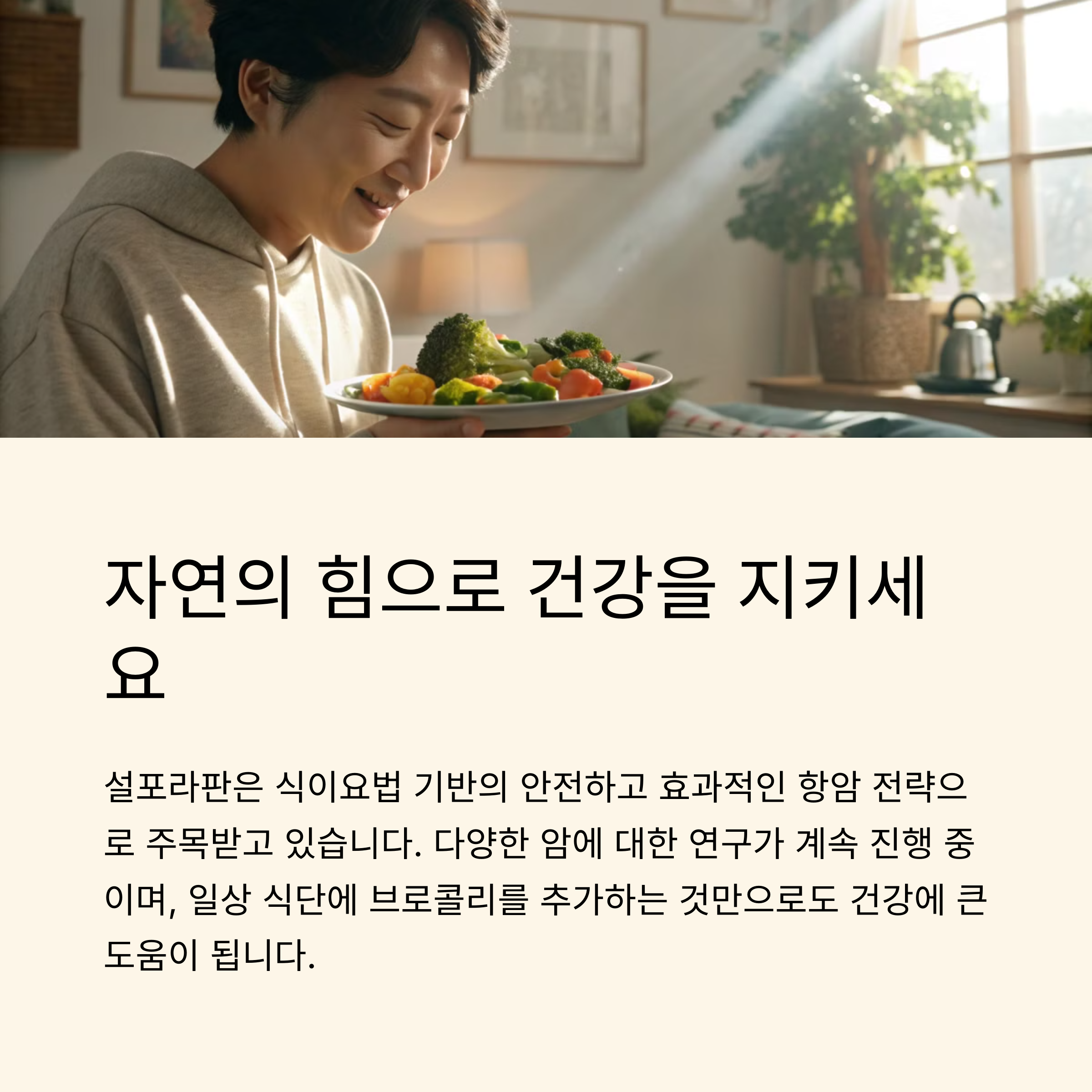 설포라판은 단순한 항산화 물질을 넘어 과학적으로 항암 기전이 증명된 천연 성분입니다. 다양한 임상 연구를 통해 유방암, 전립선암, 흑색종 등에서 긍정적인 결과를 보여주고 있으며, 암 줄기세포 억제나 재발 방지 효과까지 기대할 수 있습니다. 더불어 나노기술을 활용한 새로운 전달 방식과 병용 요법에 대한 연구도 활발히 진행 중으로, 향후 식이요법 기반의 통합적 암 예방전략에서 중심적인 역할을 할 것으로 전망됩니다. 섭취 방식, 조리법, 용량 등 세심한 관리가 필요하지만, 일상 속 작은 실천만으로도 건강한 삶을 위한 강력한 선택이 될 수 있습니다. 이제 설포라판을 여러분의 식탁에서 실천해보시길 바랍니다.