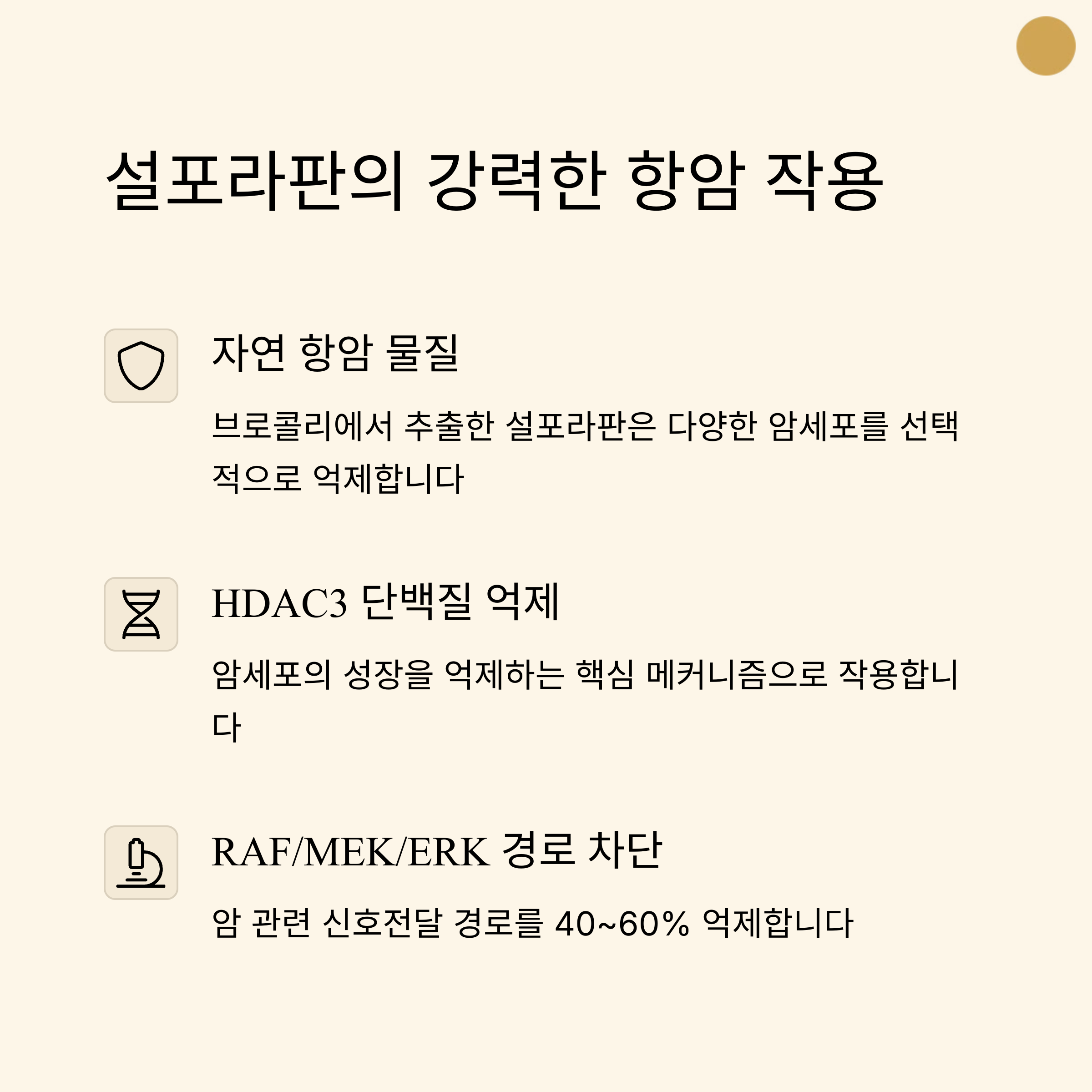 설포라판은 식물성 글루코시놀레이트의 대사산물로, 특히 브로콜리에서 높은 농도로 발견되는 항산화 성분입니다. 설포라판은 다양한 세포 신호전달 경로에 작용하며, 암세포의 증식을 억제하고 세포 사멸을 유도하는 것으로 보고되었습니다. 특히 HDAC 억제를 통해 유전자 발현 조절에 영향을 주며, 2023년 유방암 고위험군을 대상으로 한 연구에서는 설포라판 보충제를 섭취한 그룹이 HDAC3 단백질의 발현을 30~40%까지 감소시킨 바 있습니다. 이는 비정상적인 세포의 증식을 제한하고, 정상세포에는 영향을 미치지 않으면서 암세포만을 선택적으로 억제하는 유망한 전략으로 평가되고 있습니다.