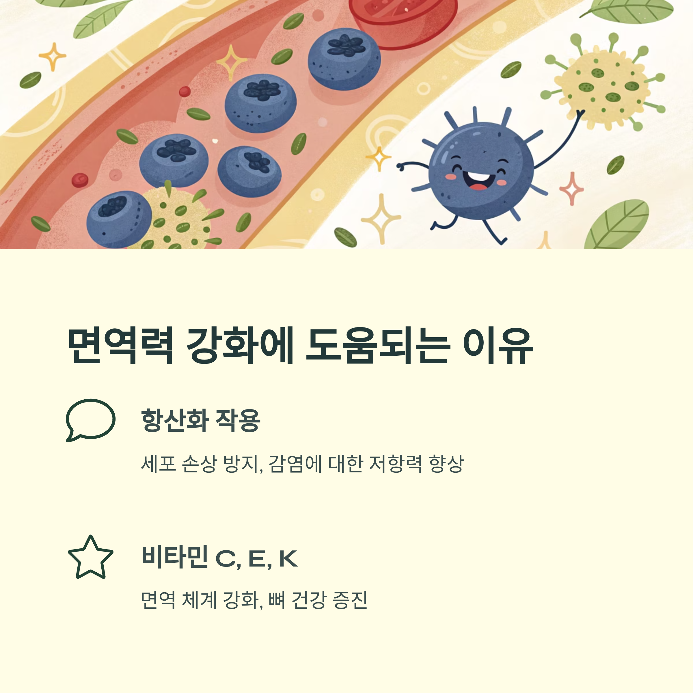 블루베리는 강력한 항산화 작용으로 면역 체계를 도와주는 식품입니다.