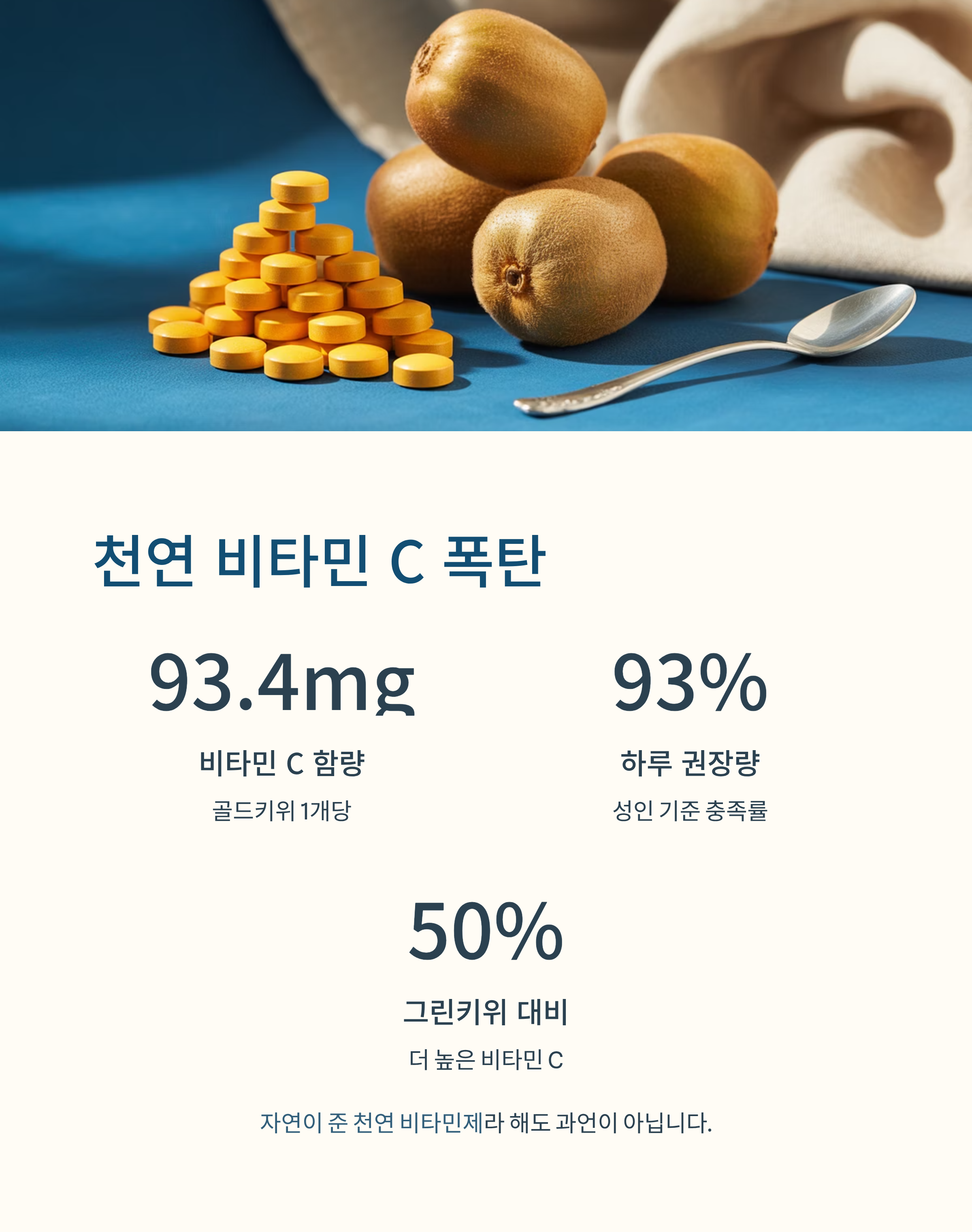 골드키위 1개에는 약 93.4mg의 비타민 C가 들어 있습니다. 성인의 하루 권장 섭취량이 100mg 안팎이라는 걸 고려하면, 키위 하나로 거의 다 채울 수 있는 셈이죠.