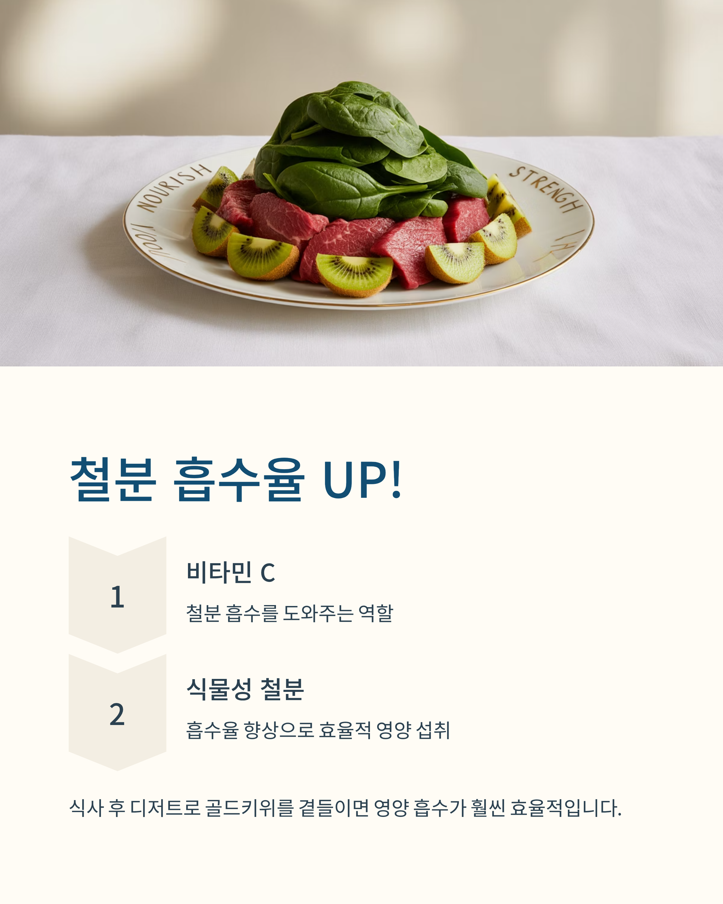 특히 식물성 철분이 포함된 식단에서는 비타민 C의 존재가 더욱 중요해지는데요, 식사 후 디저트로 골드키위를 곁들이면 영양 흡수 면에서 훨씬 효율적입니다.