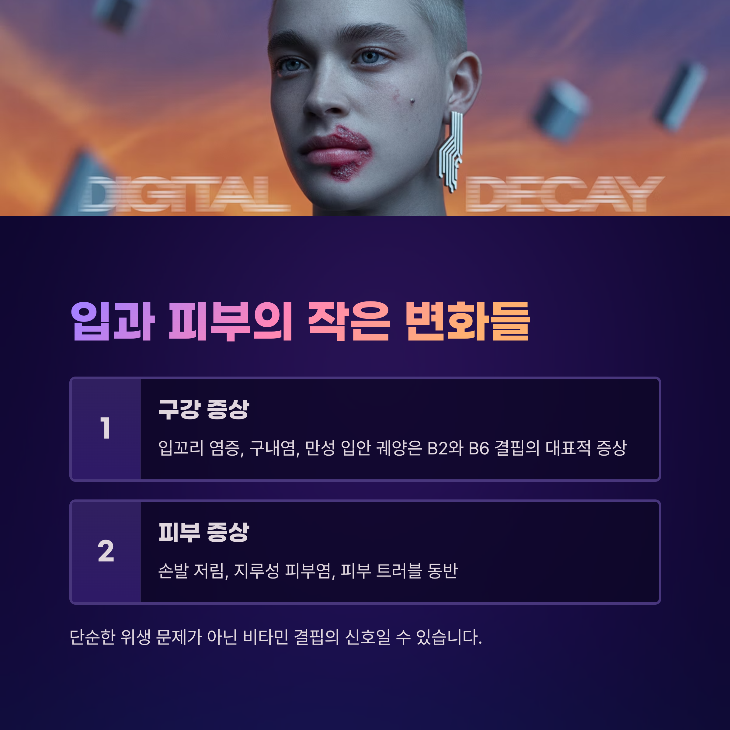 단순한 위생 문제로 보일 수 있으나 비타민B2와 B6 결핍의 대표적 증상입니다.