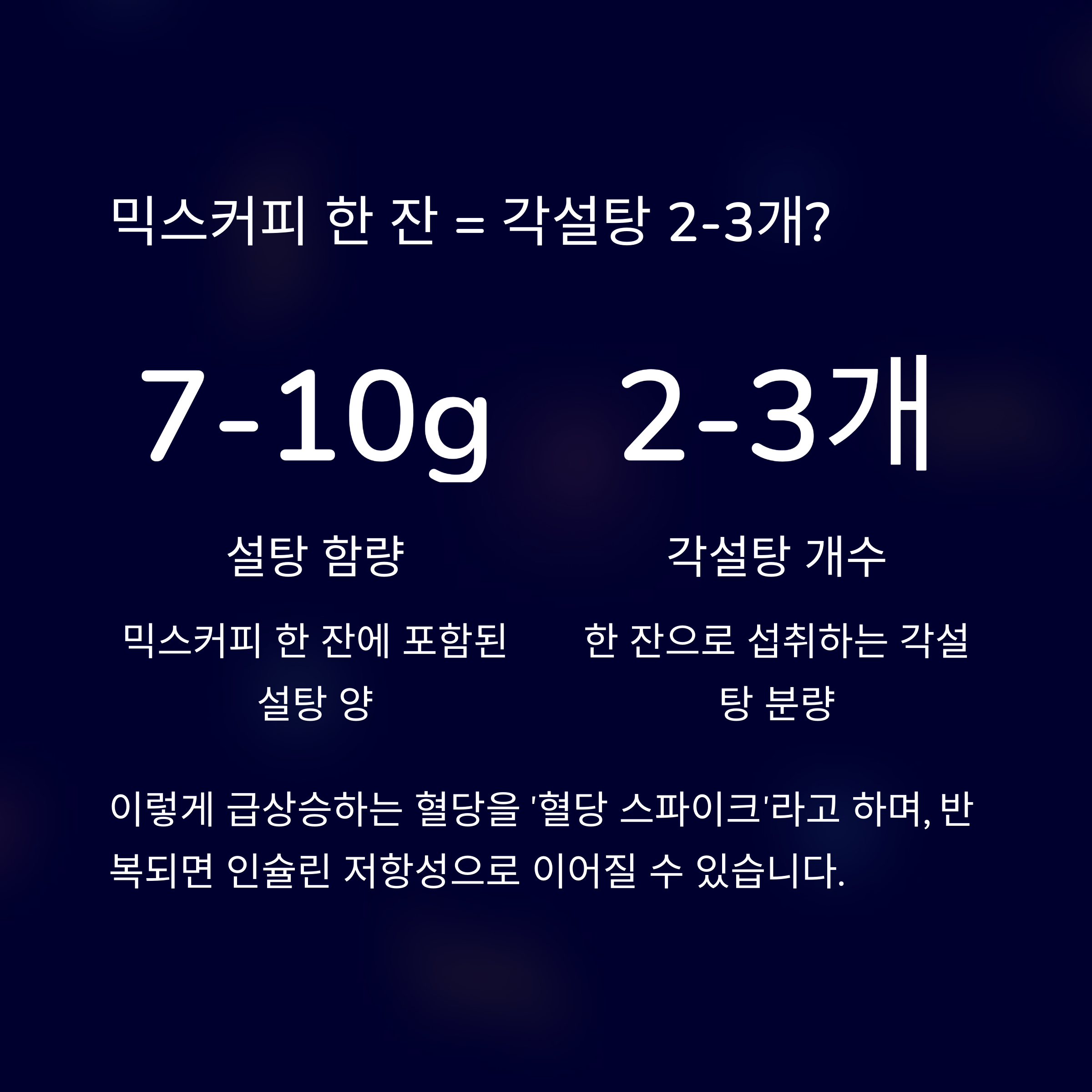 믹스커피에는 보통 7g~10g의 설탕이 포함돼 있습니다.