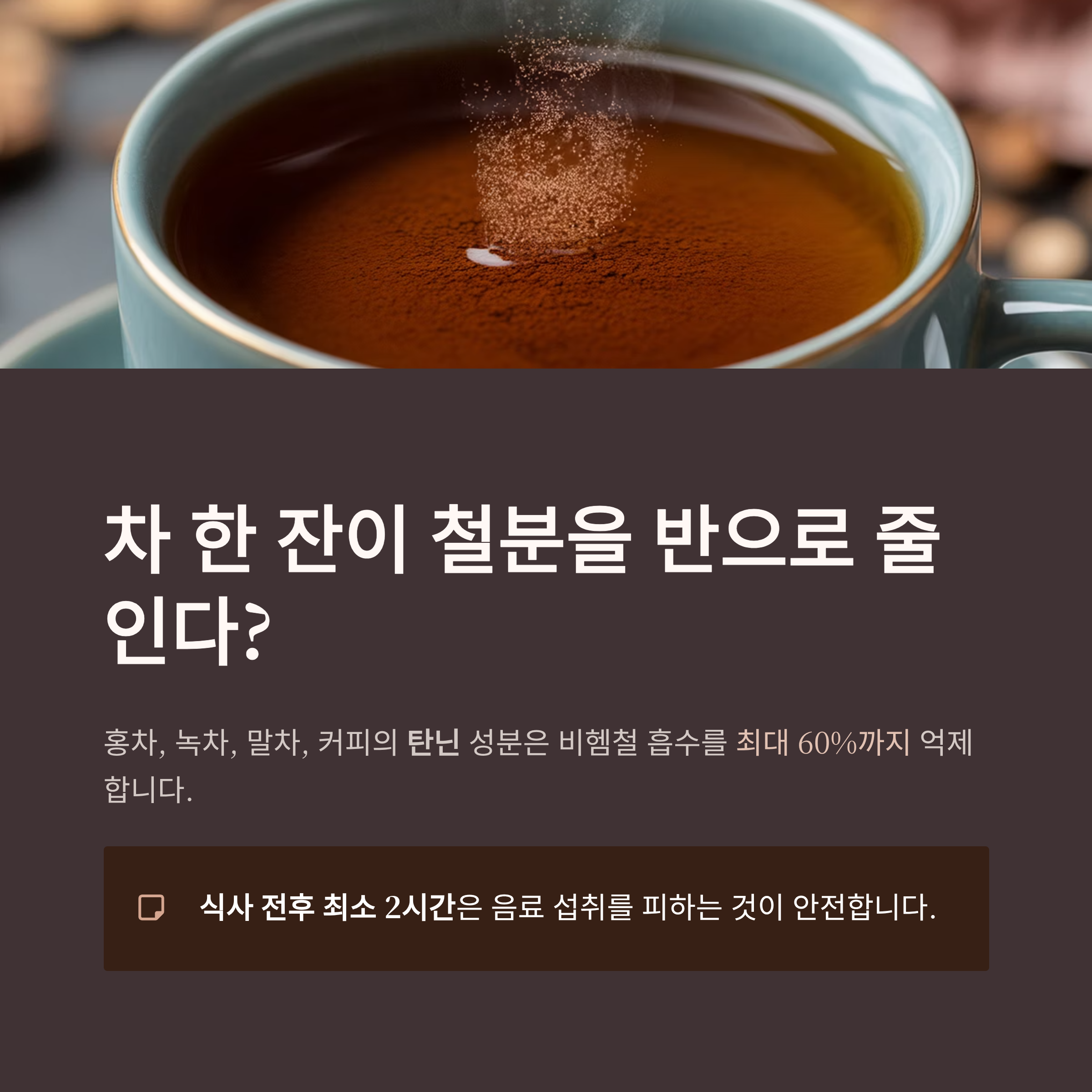 홍차, 녹차, 말차, 커피에 포함된 탄닌 성분은 비헴철 흡수를 최대 60%까지 억제합니다.