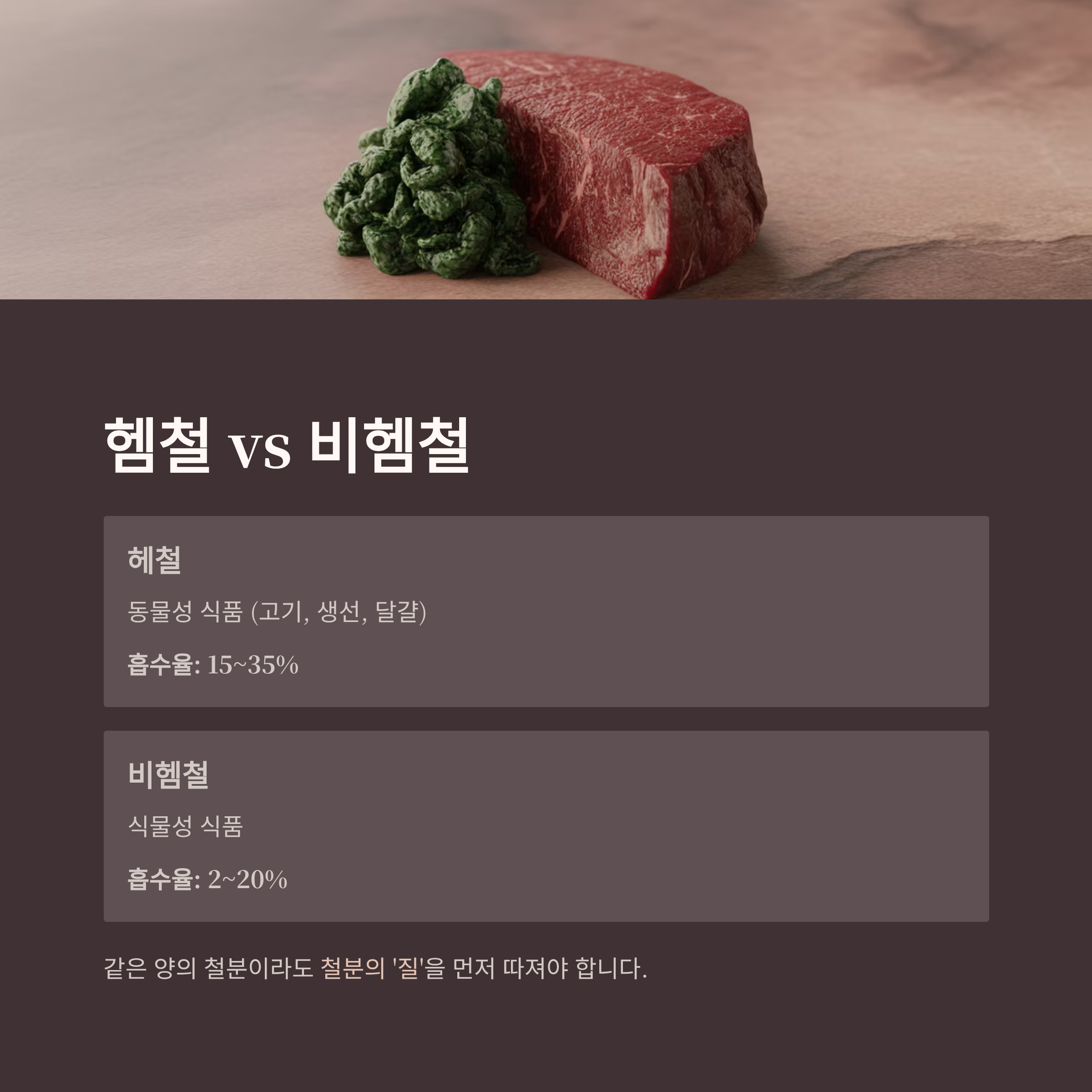 같은 양의 철분이라도 어떤 식품에서 왔는지에 따라 흡수되는 양이 달라지기 때문에, 빈혈 예방이나 개선을 위해서는 **철분의 '질'**을 먼저 따져야 합니다.