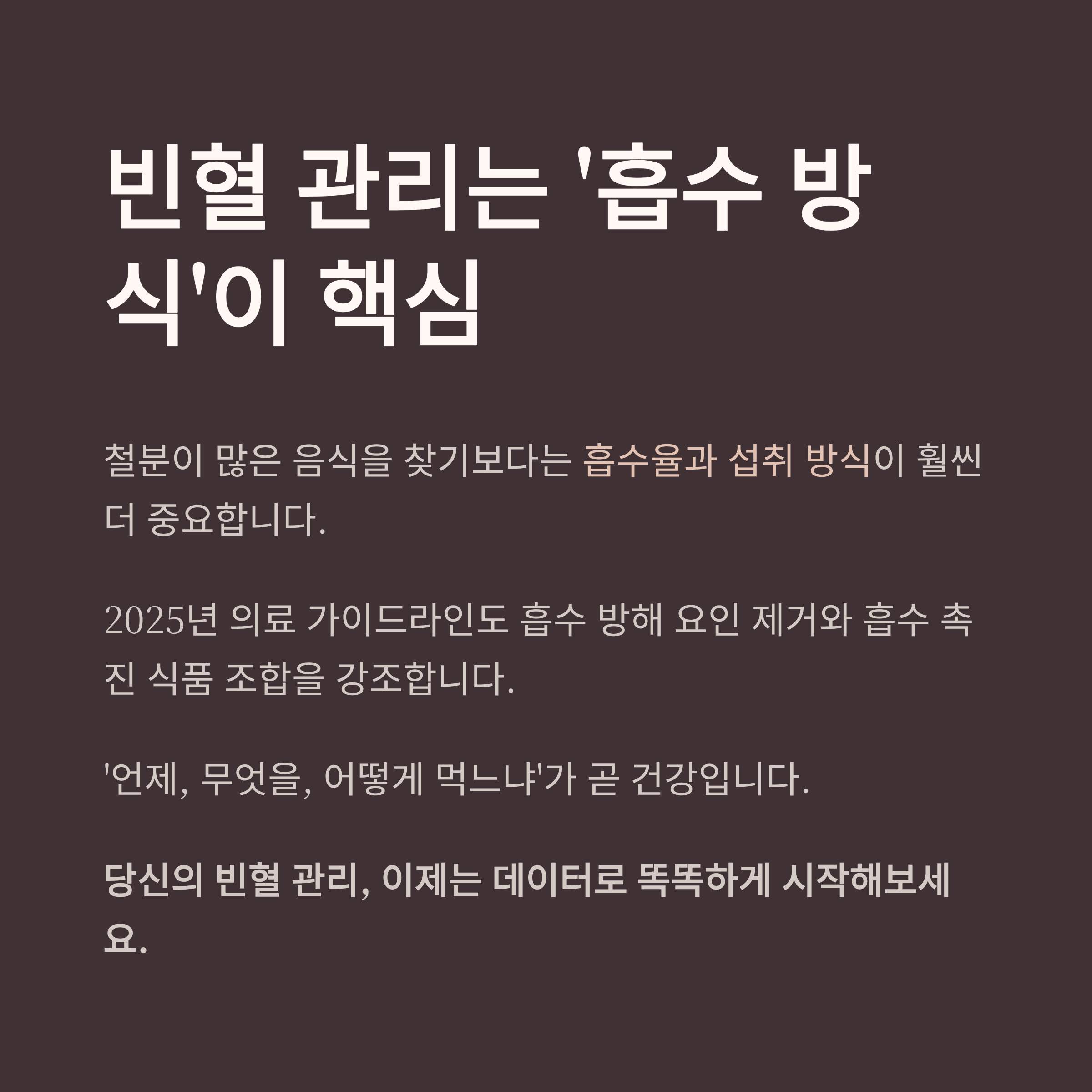 2025년 의료 가이드라인도 철분이 풍부한 음식만 챙기기보다는, 흡수 방해 요인을 제거하고, 흡수 촉진 식품과의 조합을 강조하고 있습니다.