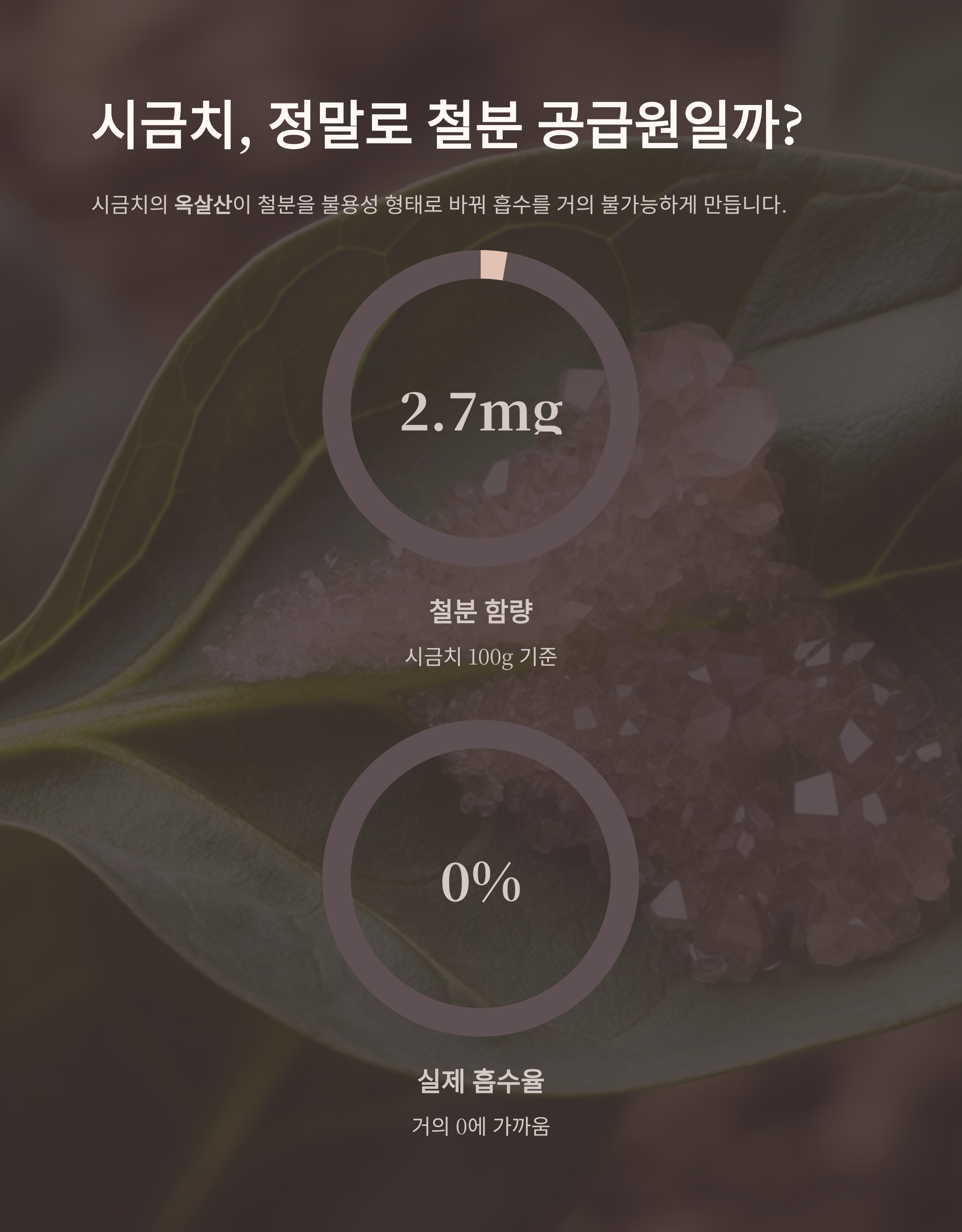 옥살산(oxalate)이라는 성분이 철분을 불용성 형태로 바꾸면서 흡수를 거의 불가능하게 만들기 때문이죠.