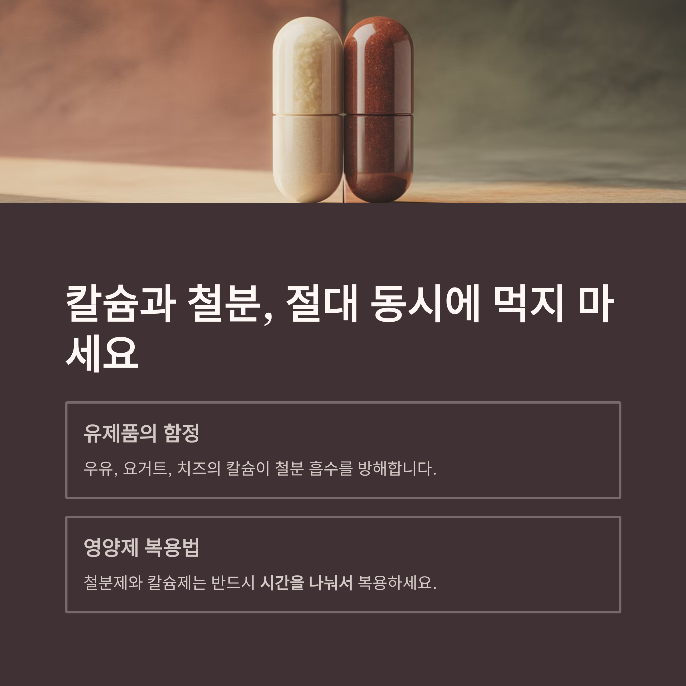 특히 철분제와 칼슘제를 함께 복용할 경우, 흡수율이 절반 가까이 떨어질 수 있어 반드시 시간을 나눠서 복용해야 합니다.