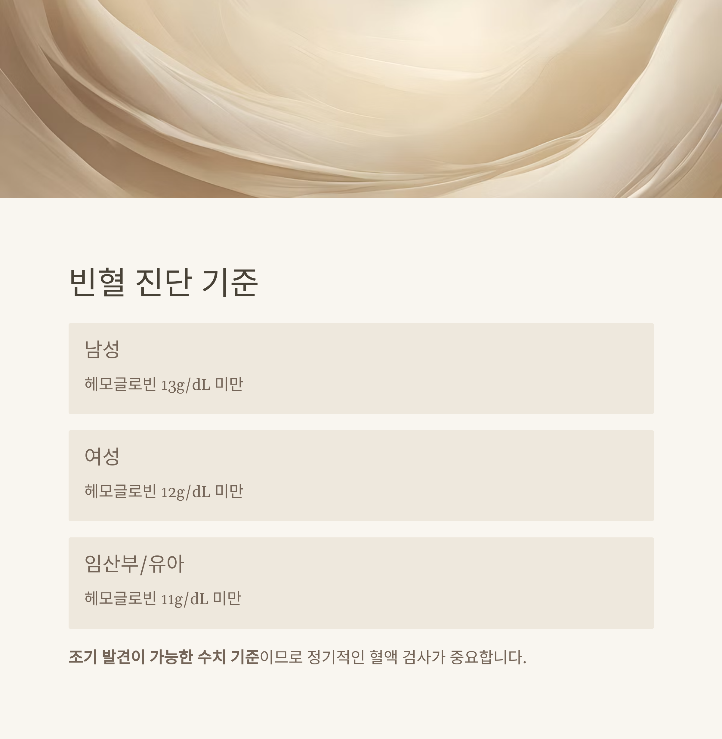 남성은 13g/dL 미만, 여성은 12g/dL 미만이면 빈혈로 진단됩니다.