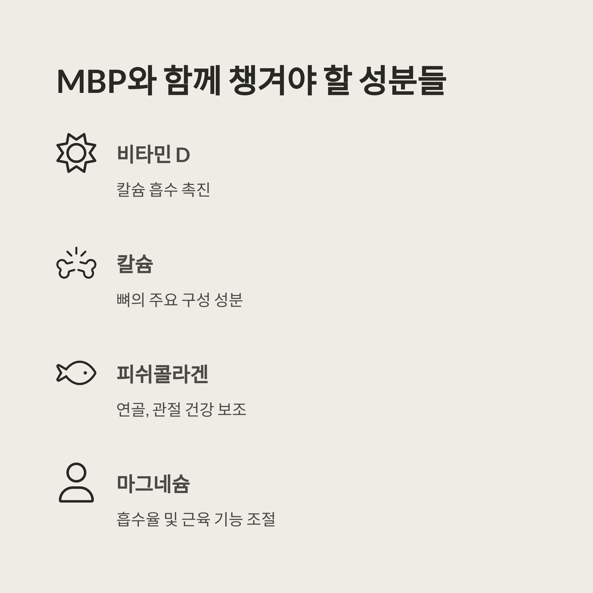 MBP 단독 섭취만으로는 장기적인 뼈 건강 관리에 한계가 있습니다.