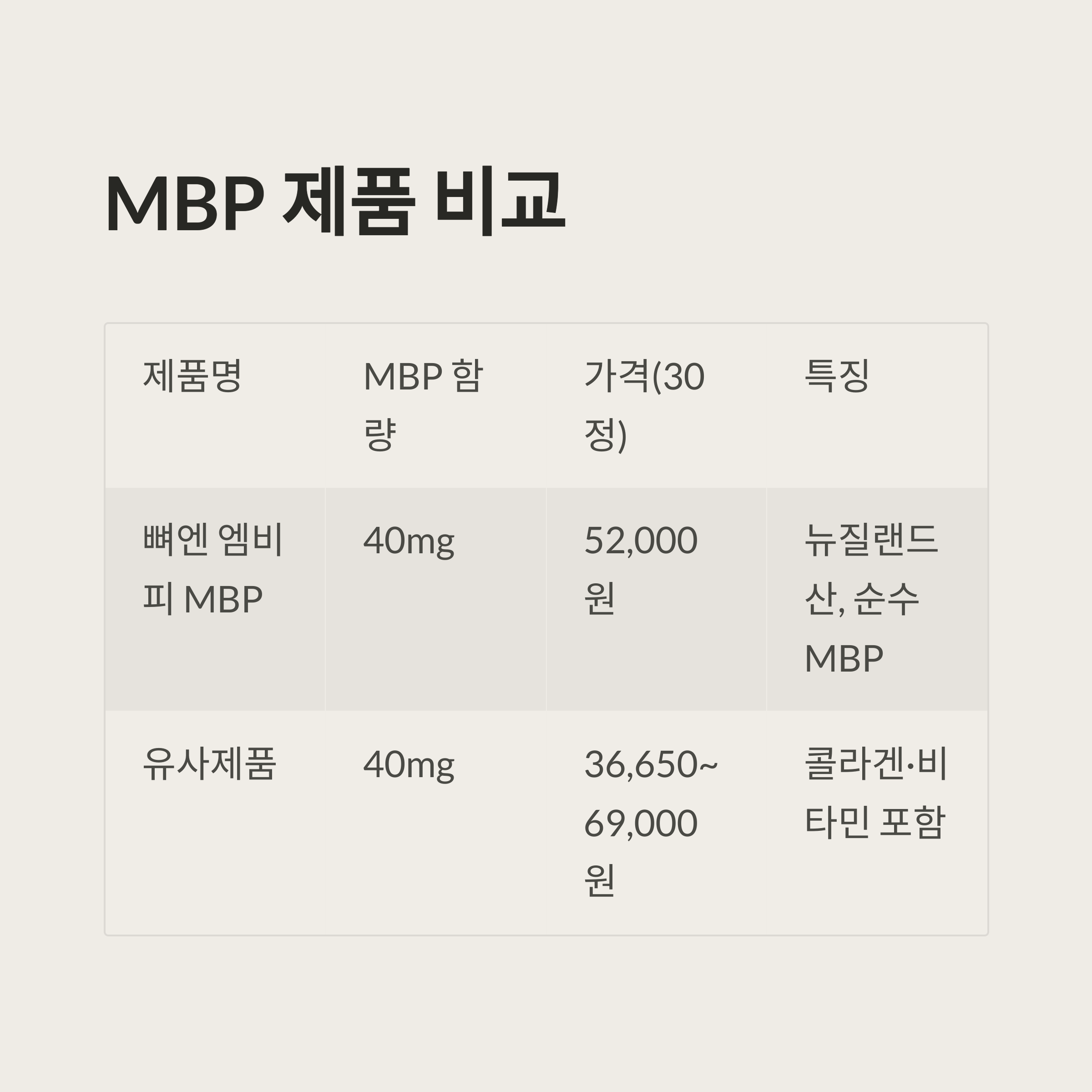 대표 제품인 '뼈엔 엠비피 MBP'와 유사 제품 정보를 표로 정리했습니다.